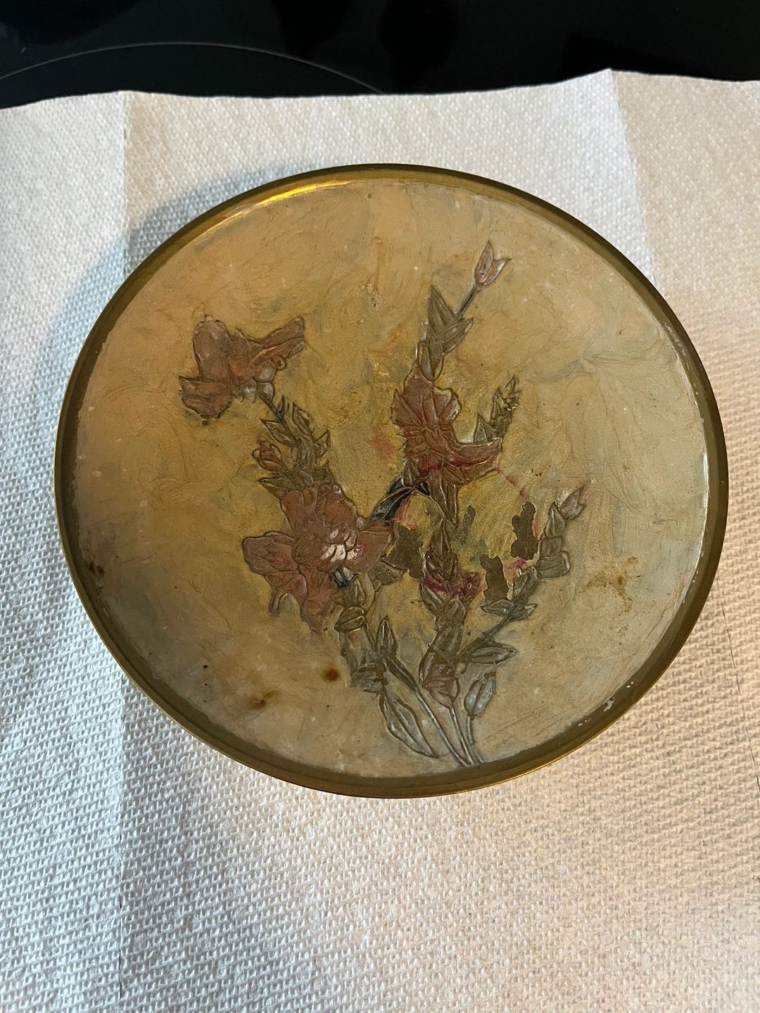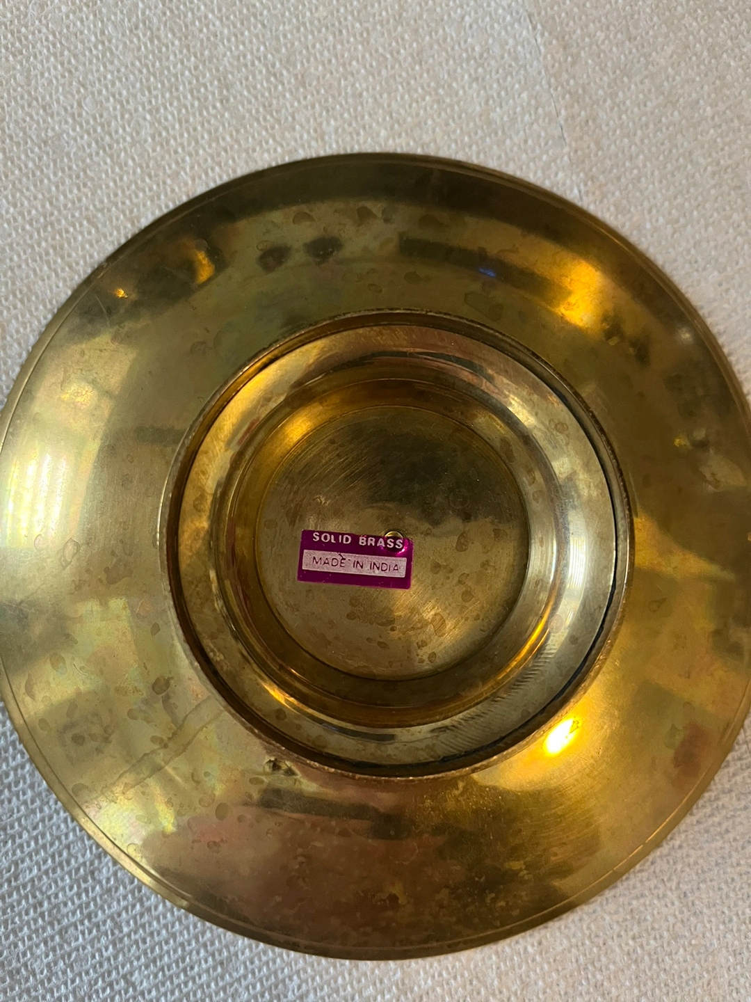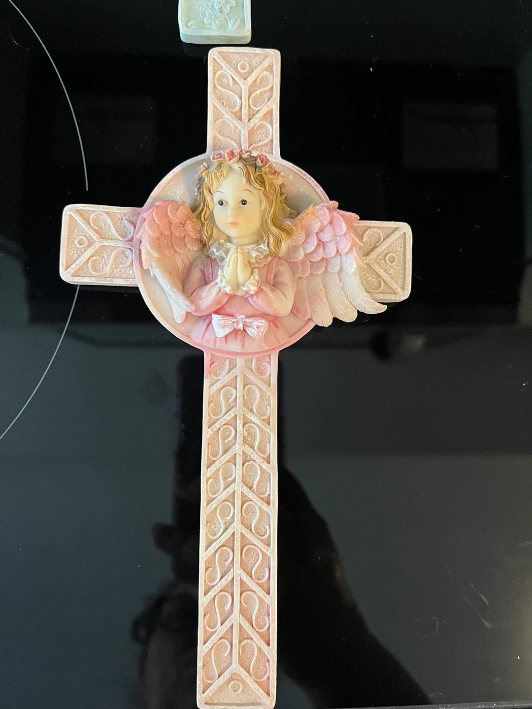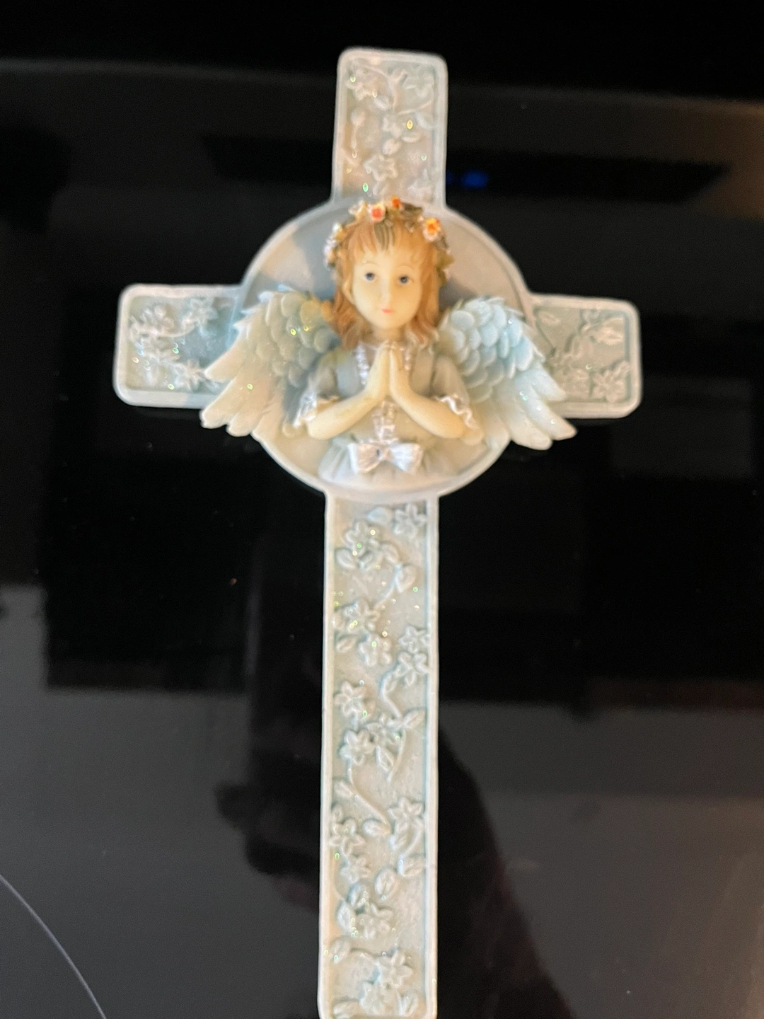 A beautiful porcelain angel cross with a glittery blue finish and a solid brass tray with a floral design. Made in India. The tray is approximately 6.5 inches in diameter. Also, wooden statues