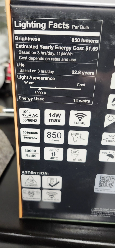 This is a wireless HD camera light bulb that is compatible with both Android and iPhone devices. It is 60W equivalent and provides 850 lumens of light. It also has a 14W power consumption and a 2.4 & 5.6 GHz frequency.