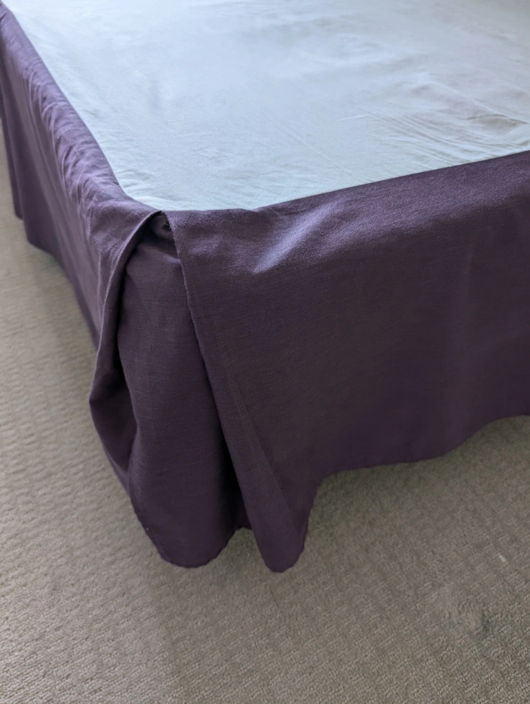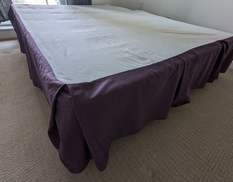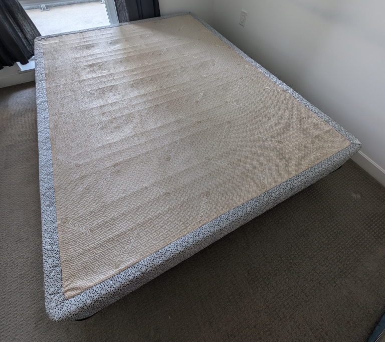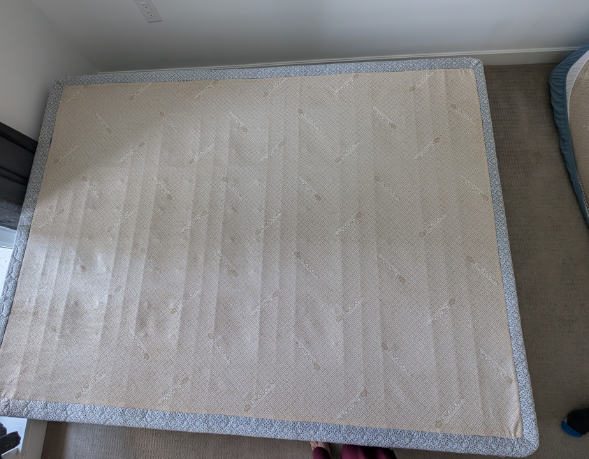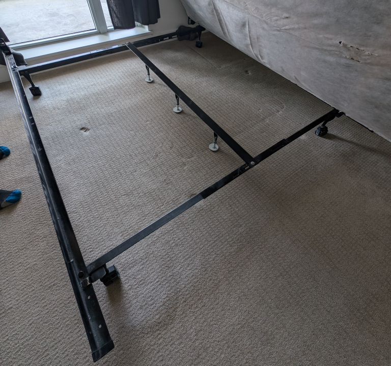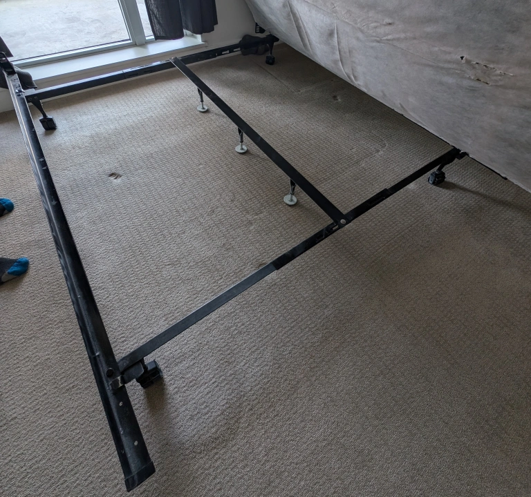 Queen metal bed frame & box spring. Box spring measures 200cm long, 150cm wide, 40cm high (from ground to top of box spring) Bed Frame fits the box spring. Wheels on the side, and support posts in the middle. Free purple sheet to cover box spring if you want it! Moving abroad so can't take it with me!