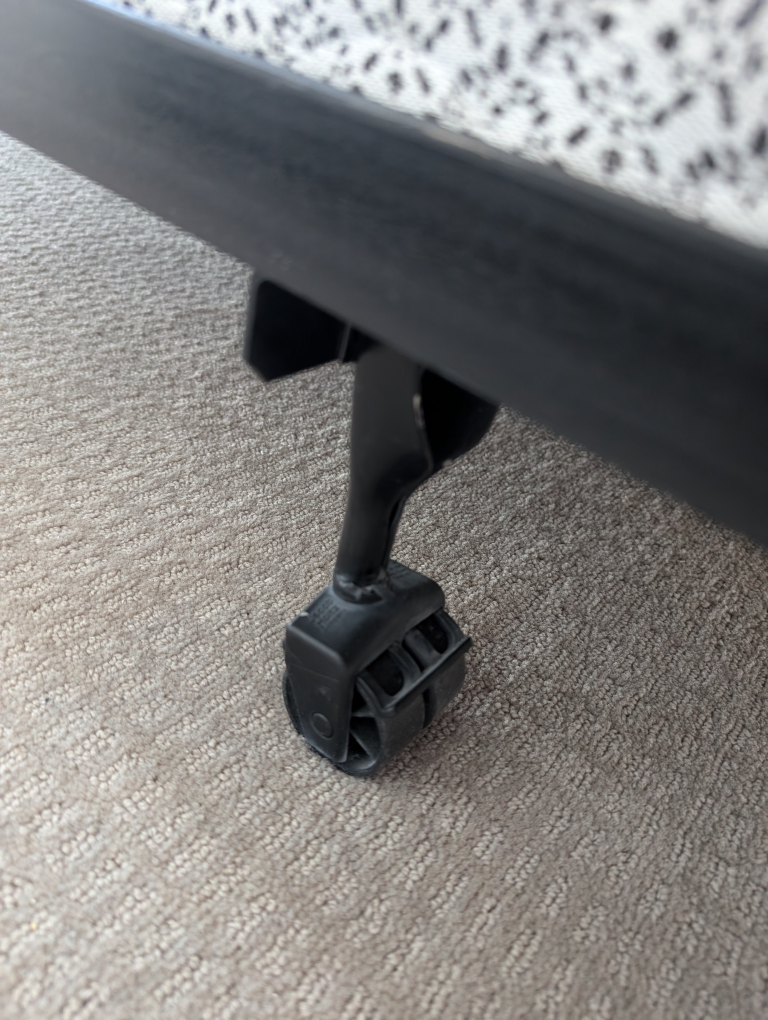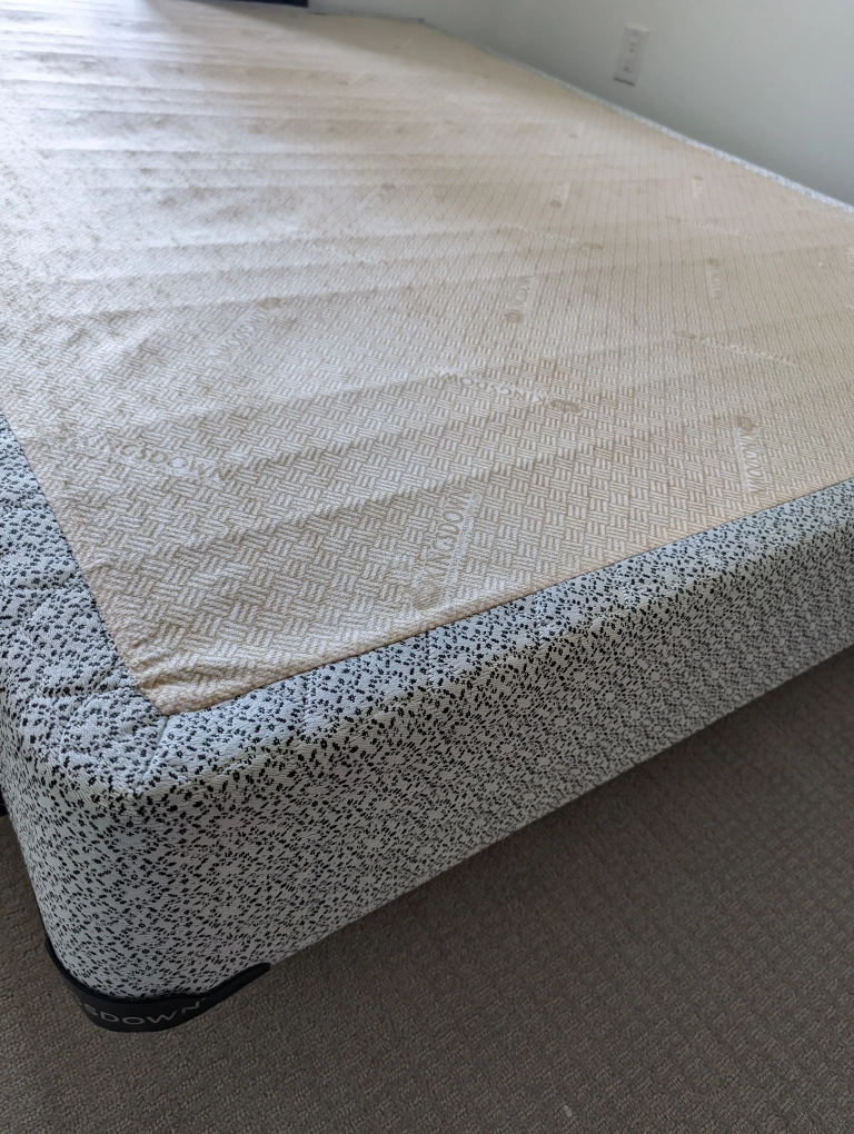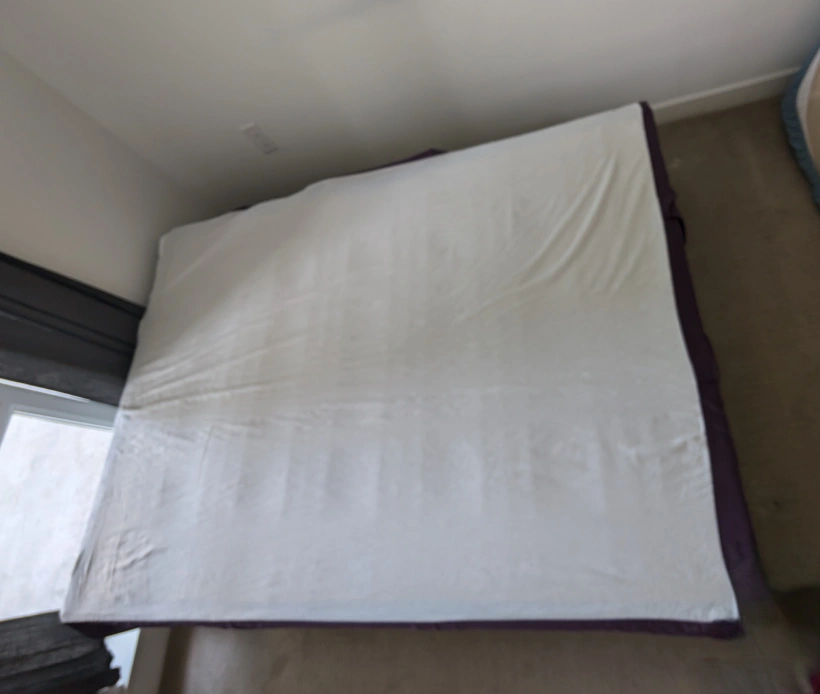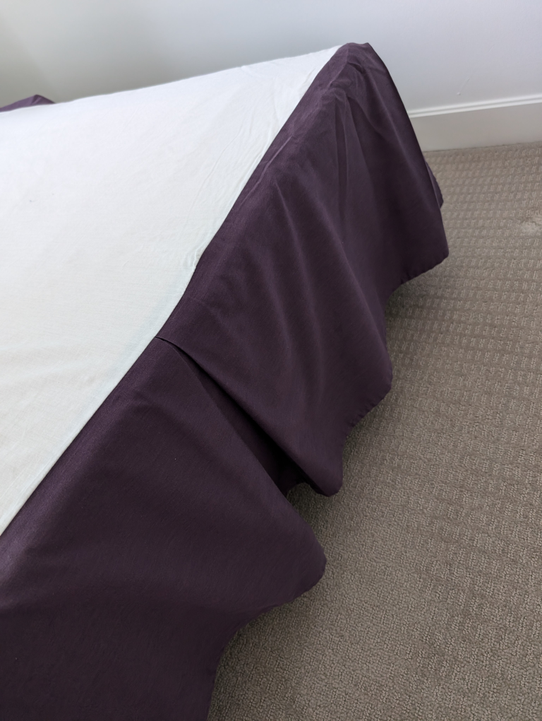 Queen metal bed frame & box spring. Box spring measures 200cm long, 150cm wide, 40cm high (from ground to top of box spring) Bed Frame fits the box spring. Wheels on the side, and support posts in the middle. Free purple sheet to cover box spring if you want it! Moving abroad so can't take it with me!