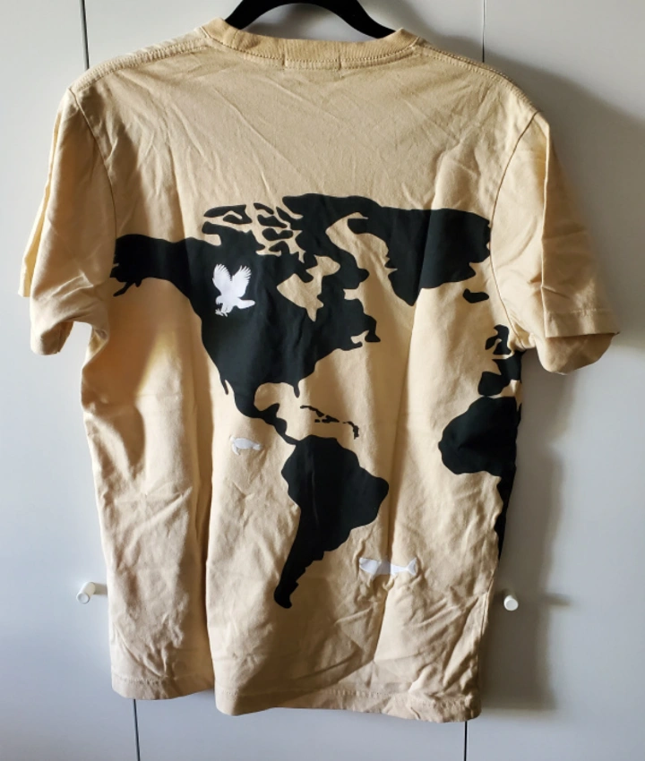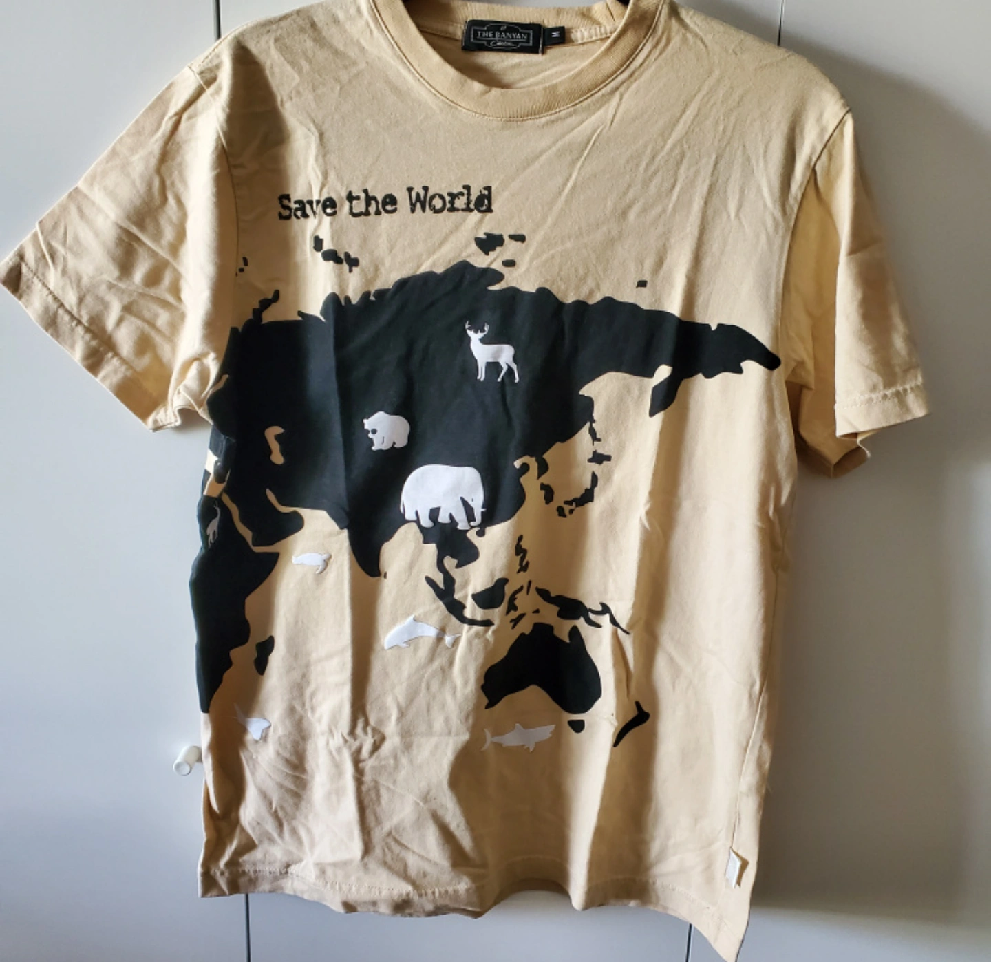 This T-shirt features a black and white graphic of the world with a variety of animals. It says "Save the World" at the top. The T-shirt is a light tan colour. It has short sleeves and a crew neck. The brand is The Banyan.