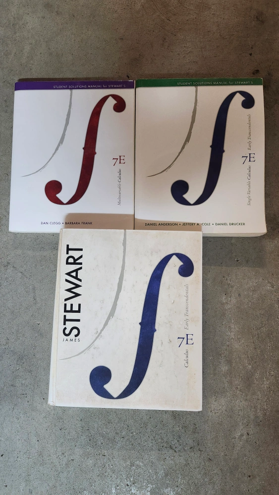 Set of three Calculus textbooks by James Stewart, 7th Edition. Includes the textbook, Early Transcendentals, and the student solutions manuals for Single Variable Calculus and Multivariable Calculus. No writing on the inside, just the cover that's stained somewhat
