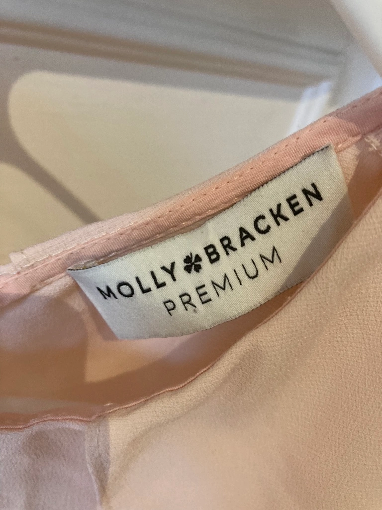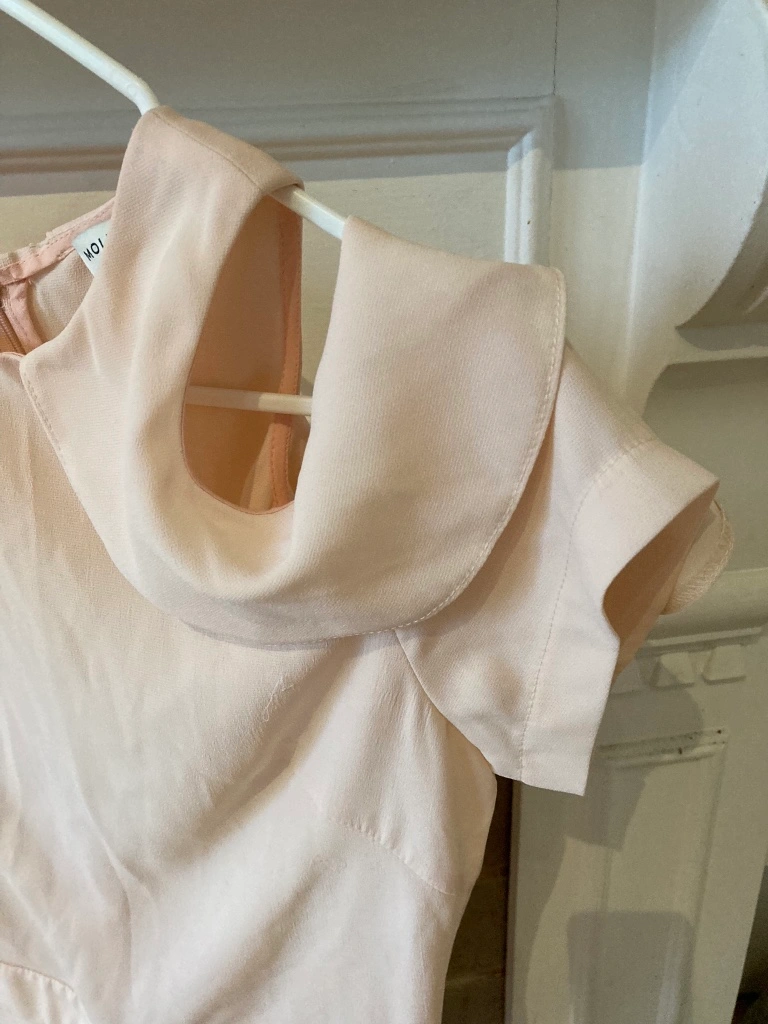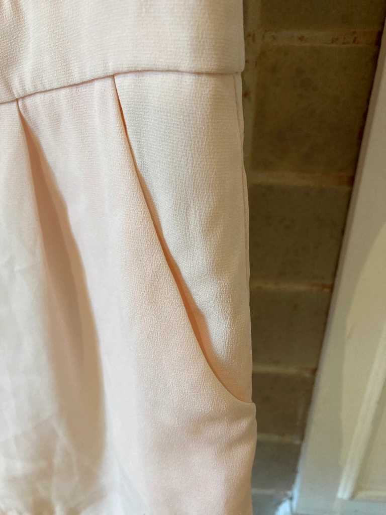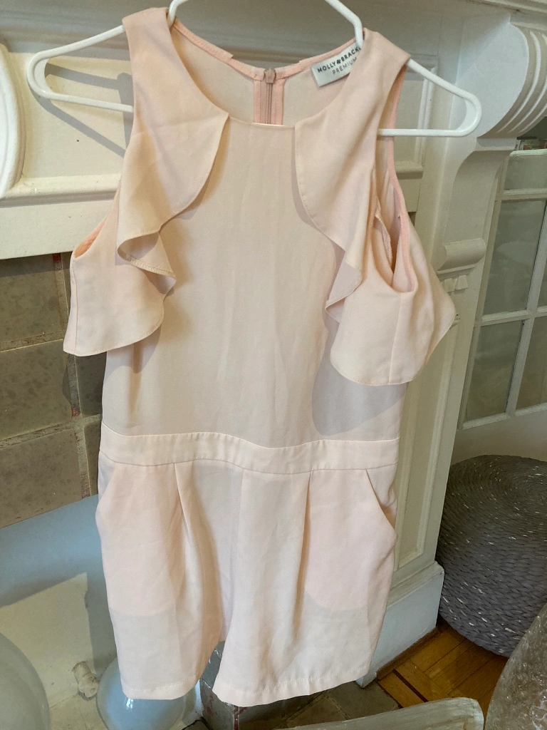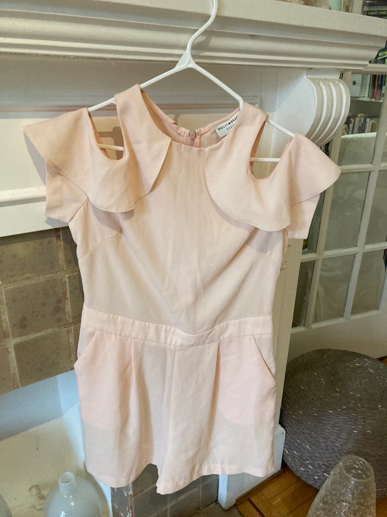 Pale peach Molly Bracken sort sleeve open shoulder romper with frill over sleeve side pockets. Designer sample fits XS