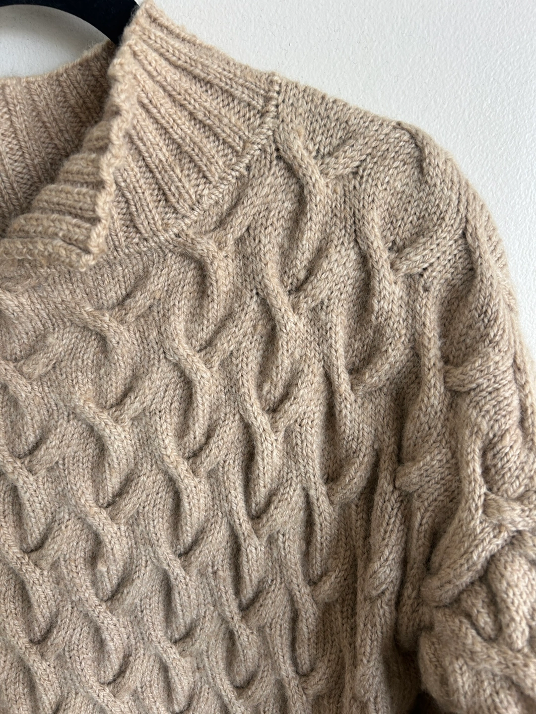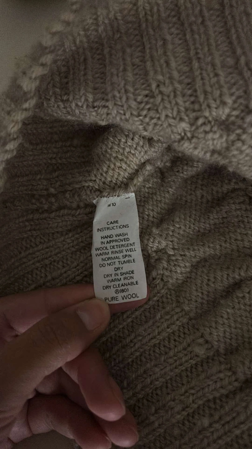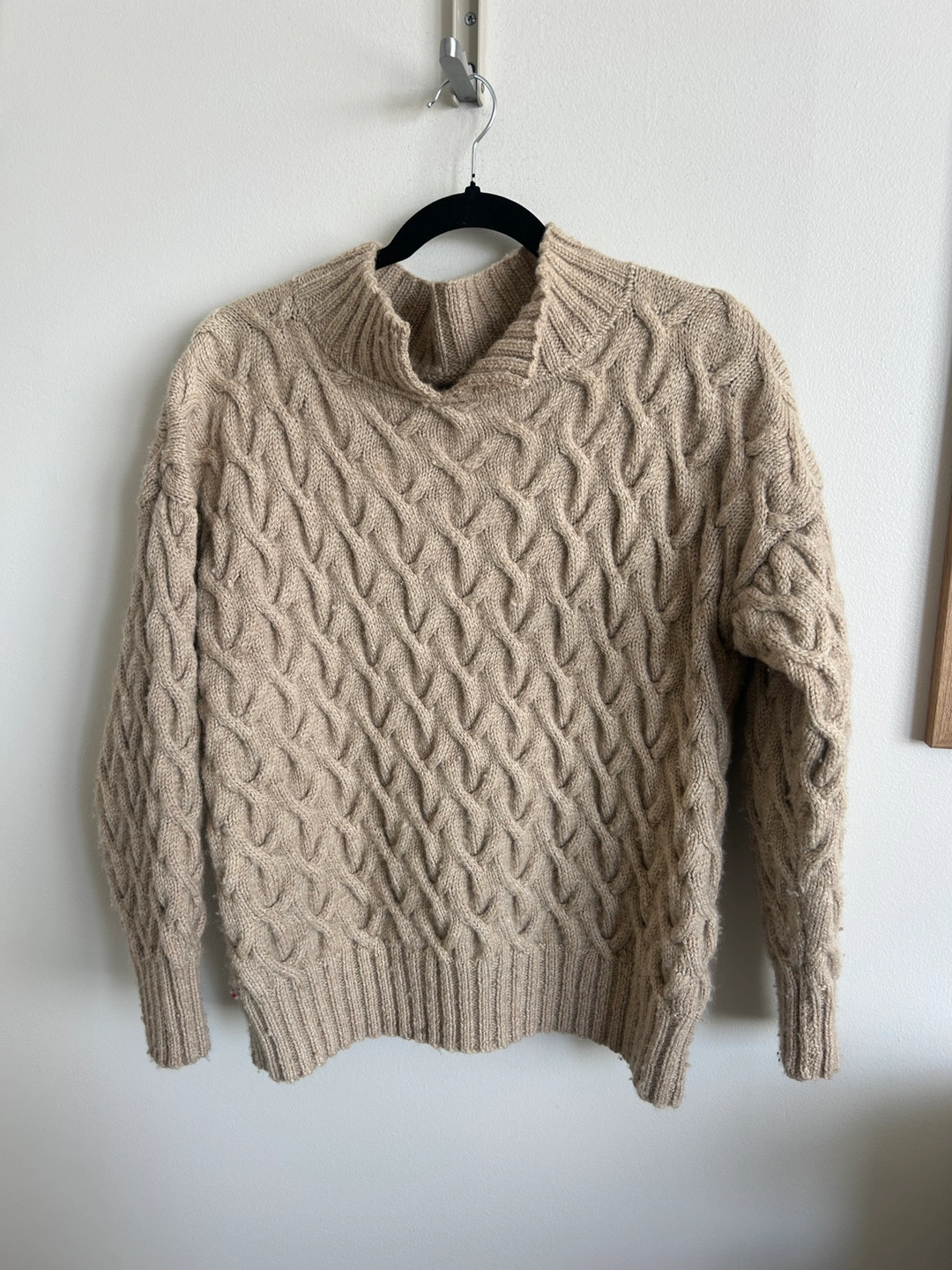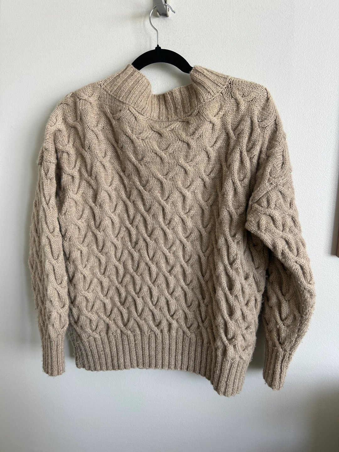 A wool beige sweater with a cable knit design. A little scratchy so I’d recommend wearing something underneath. Very cozy and cute for fall/winter