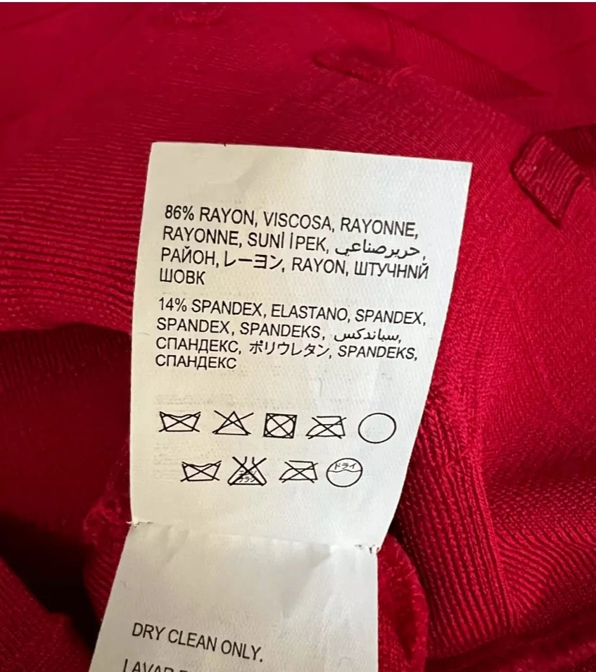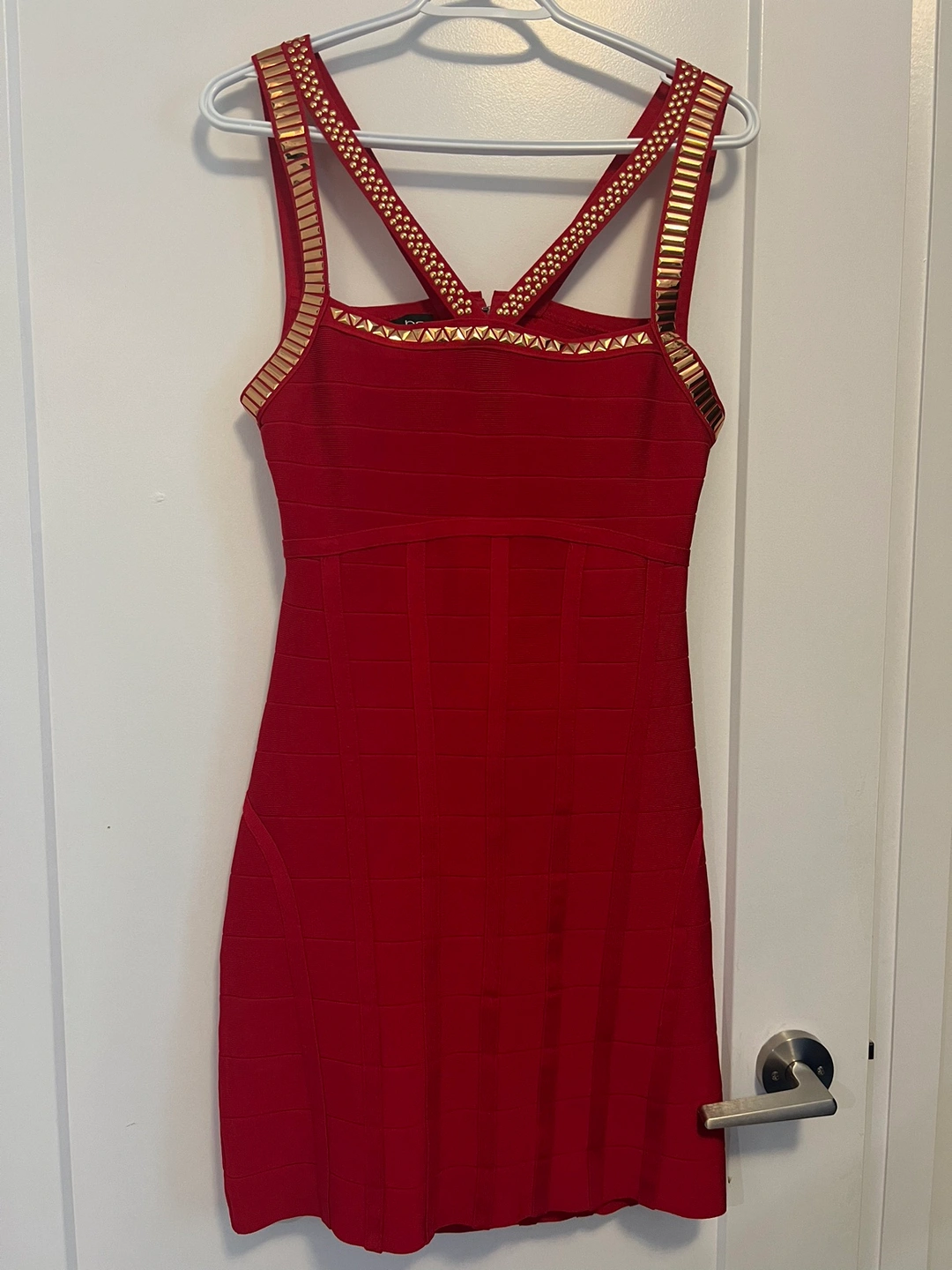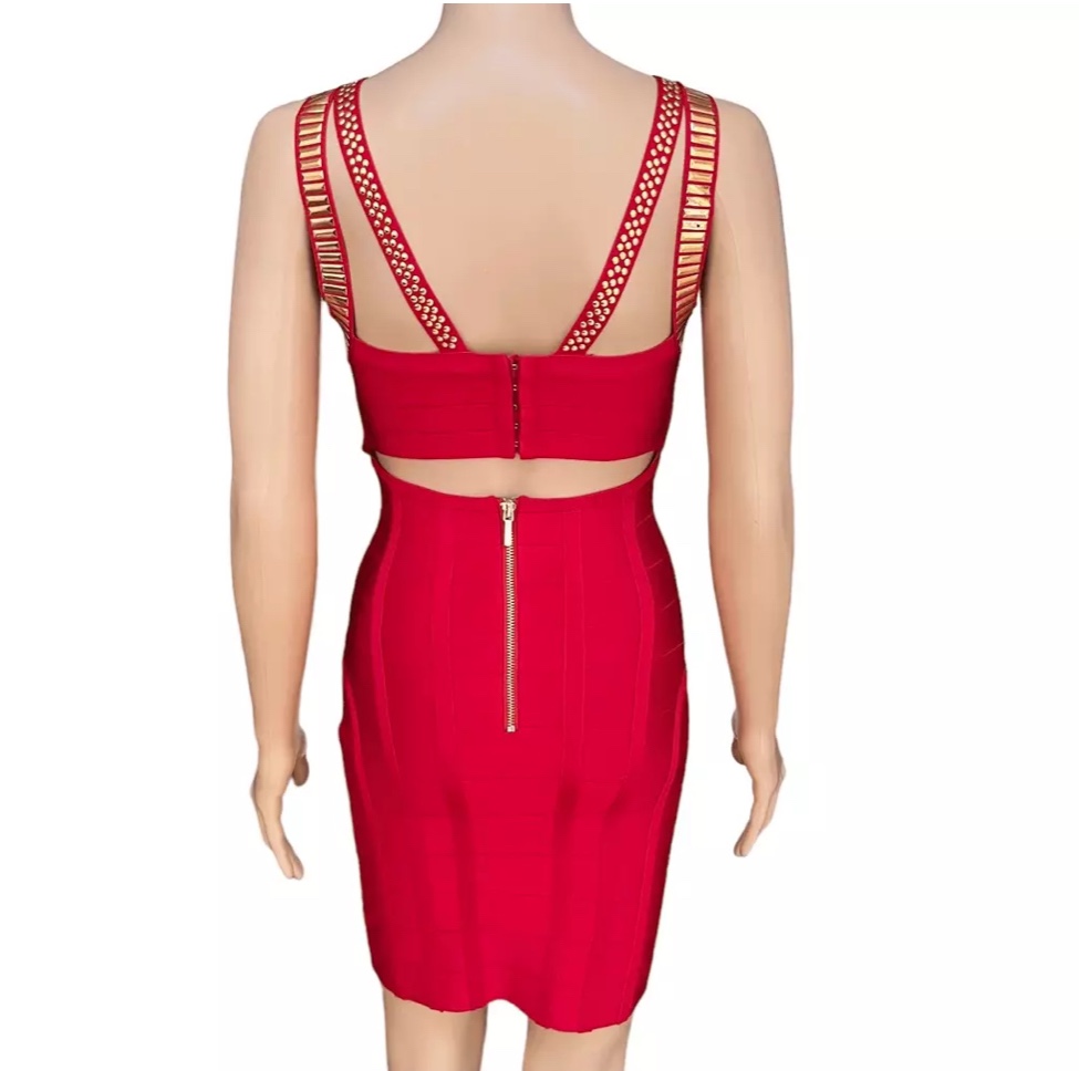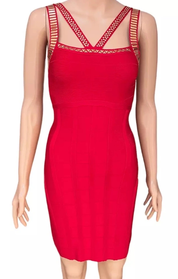 This is a stunning red bandage dress with gold detailing. It is sleeveless and has a fitted silhouette. It would be perfect for a night out.
