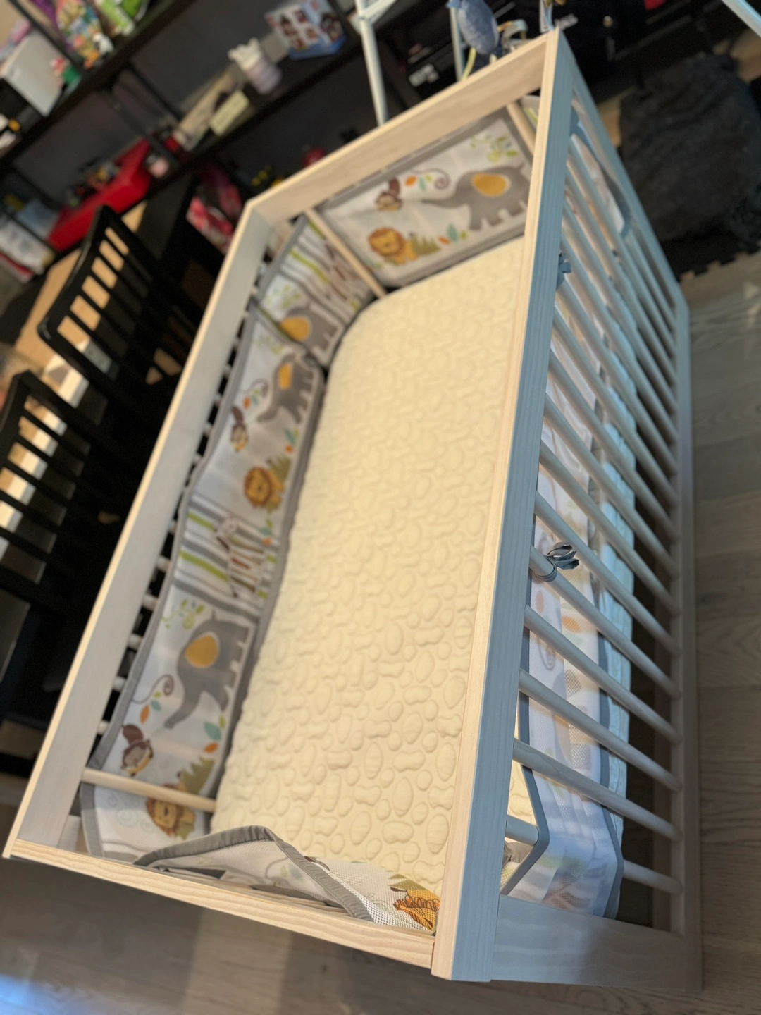 Barely used for 6 months, no scratches or damage. It comes with mattress and mattress protector, you can see it on photo.