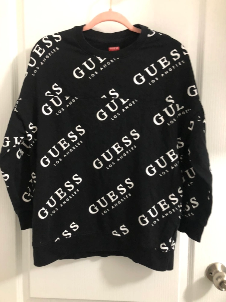 Black long-sleeved sweatshirt with the Guess logo repeated all over.