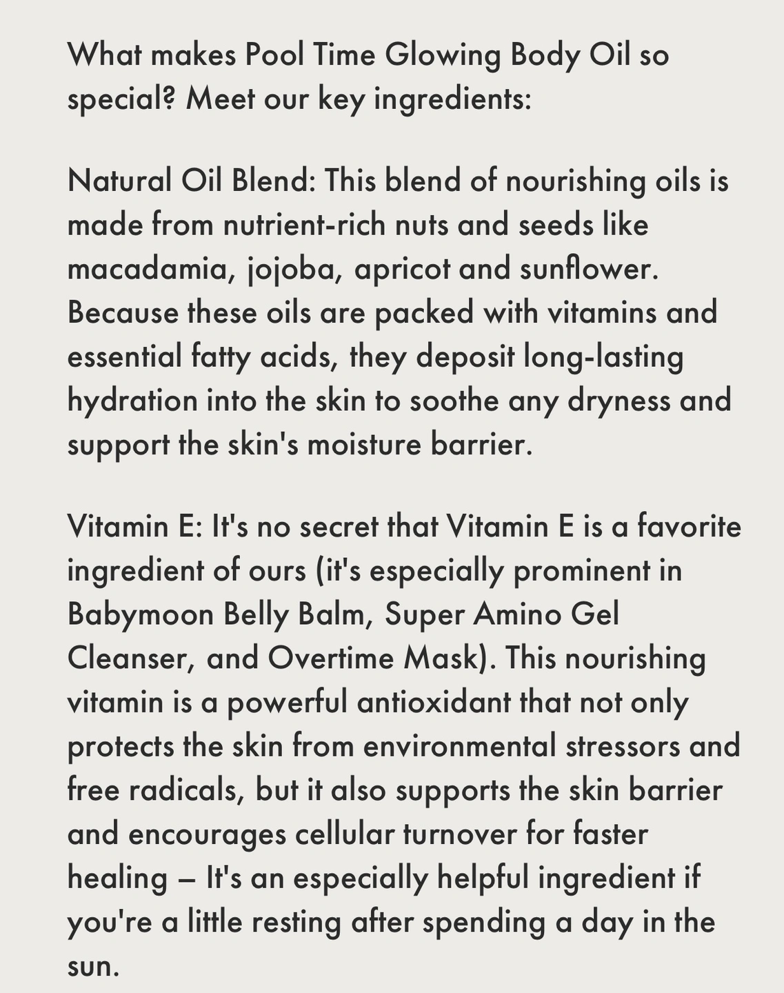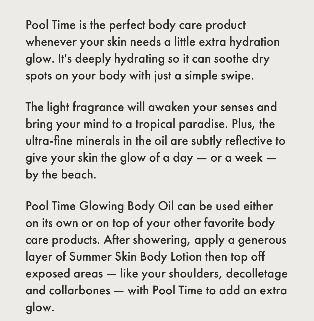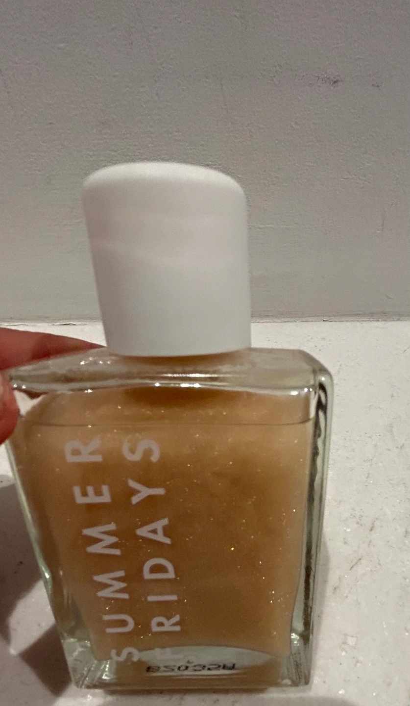 A body oil that gives skin a beautiful glow. Summer Fridays Pool Time glowing body oil. 3.2 fluid ounces. New. Never used. #summerfridays #pooltime #glowingbodyoil #bodyoil #shimmer