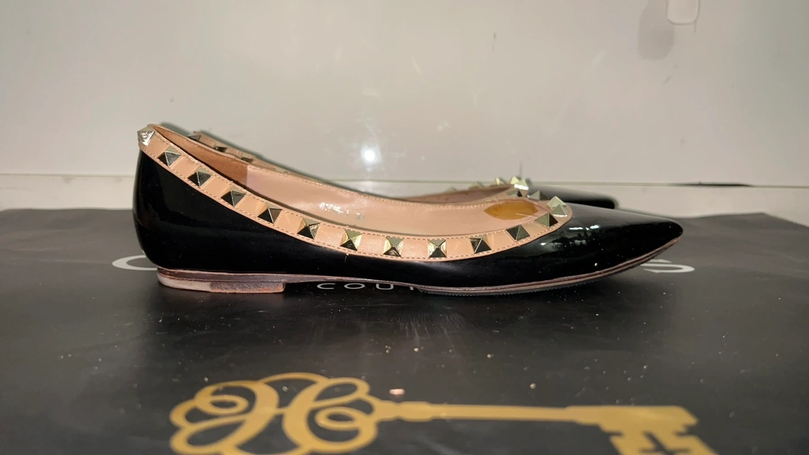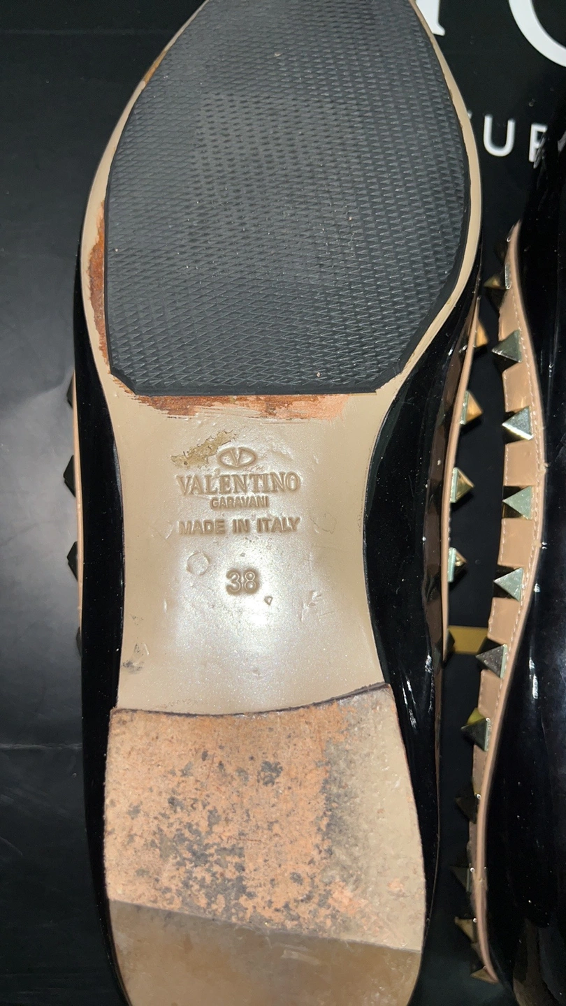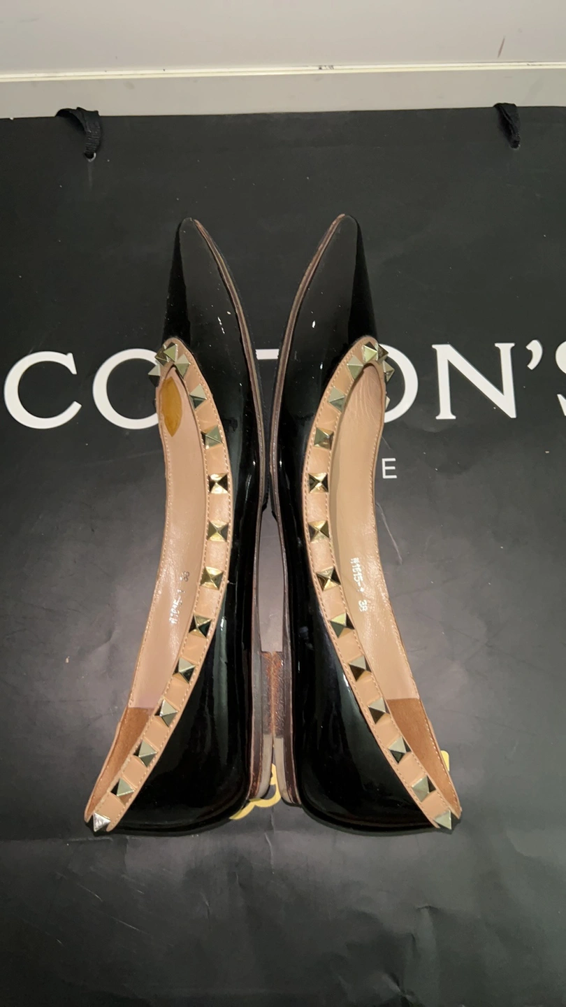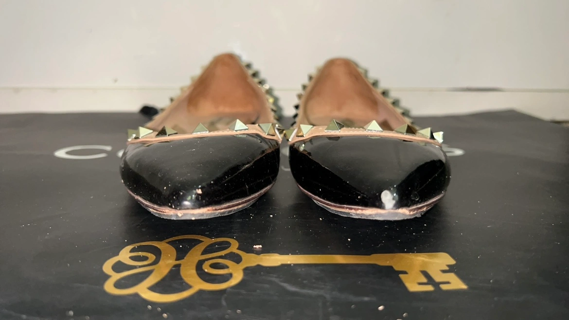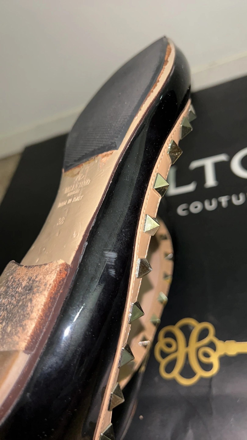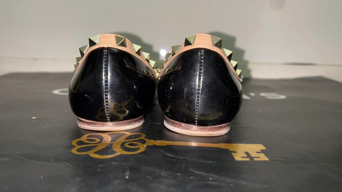 Black patent leather ballet flats with gold studs. Size 38. Made in Italy.