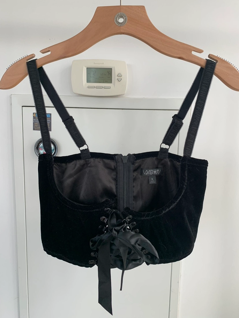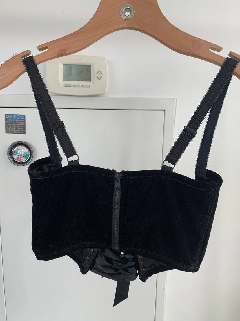 Size small, black velvet corset top with a lace-up back. Features a zipper in the back. The straps are adjustable. Worn once, no flaws.