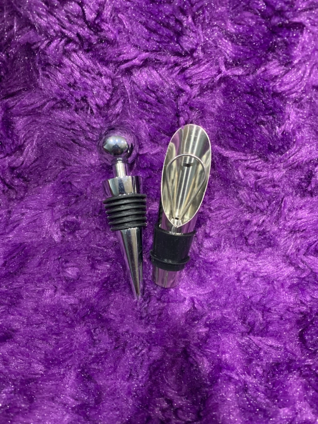 This set includes a wine stopper with a decorative ball top and a stainless steel wine pourer with a black rubber stopper. Both are made of durable metal construction. They help preserve your wine and ensure a clean pour.