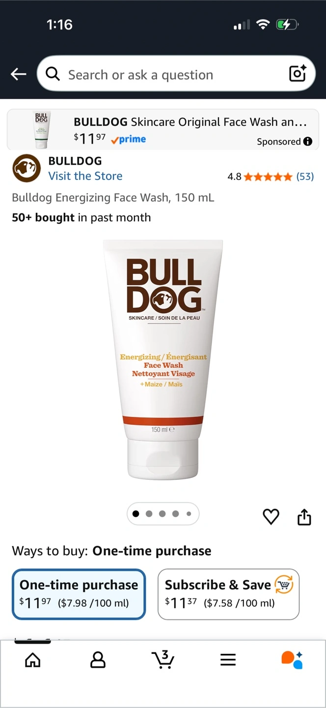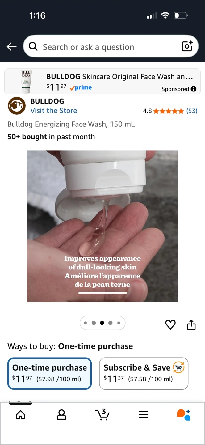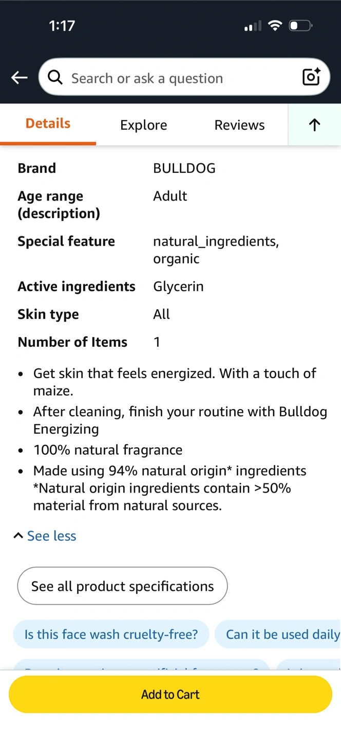 Bulldog Skincare Energizing Face Wash, 150 mL. Made using 94% natural origin ingredients. It's suitable for all skin types and revitalizes and cleanses the skin. This face wash is great for a morning routine to help energize your skin.