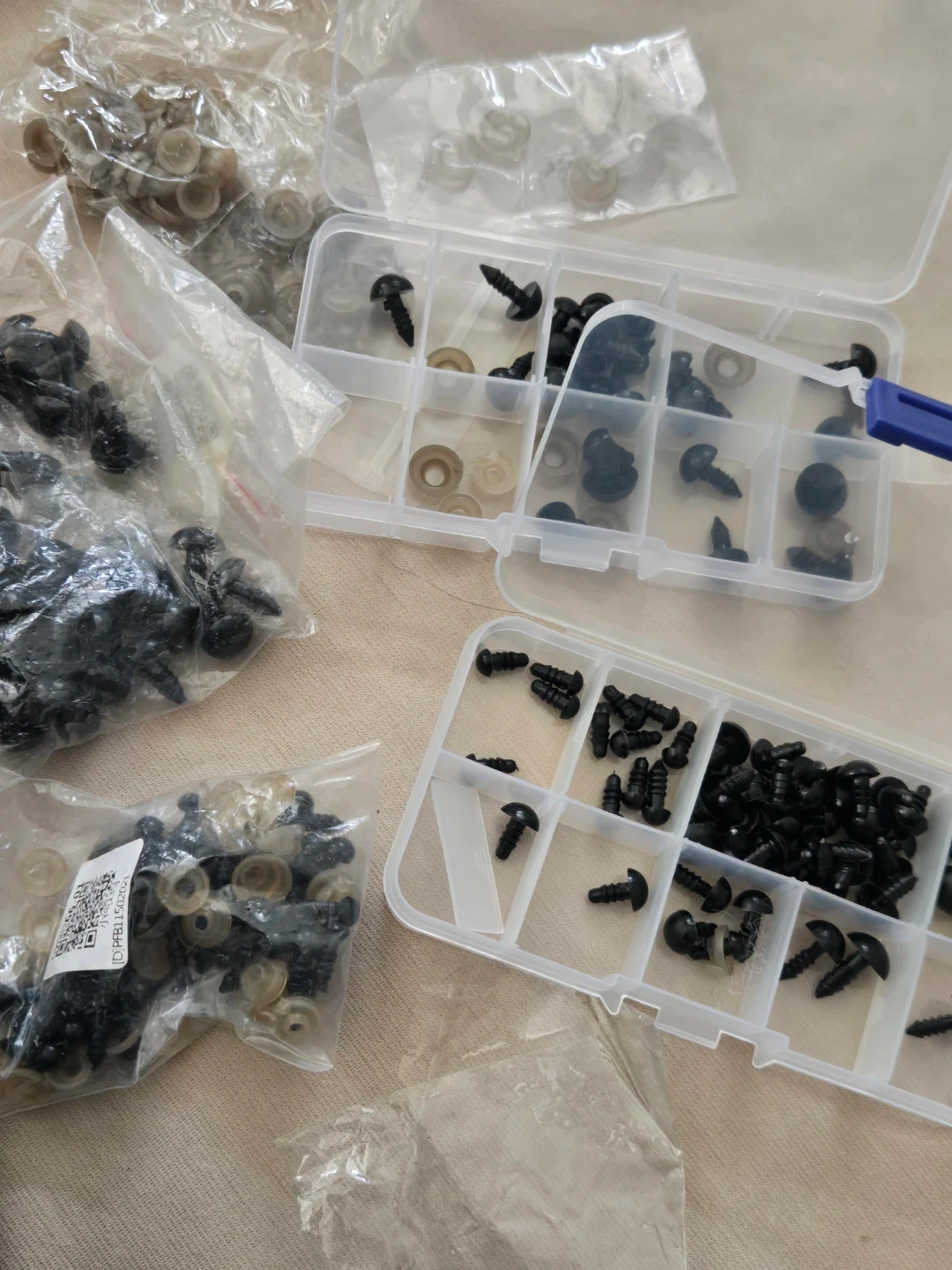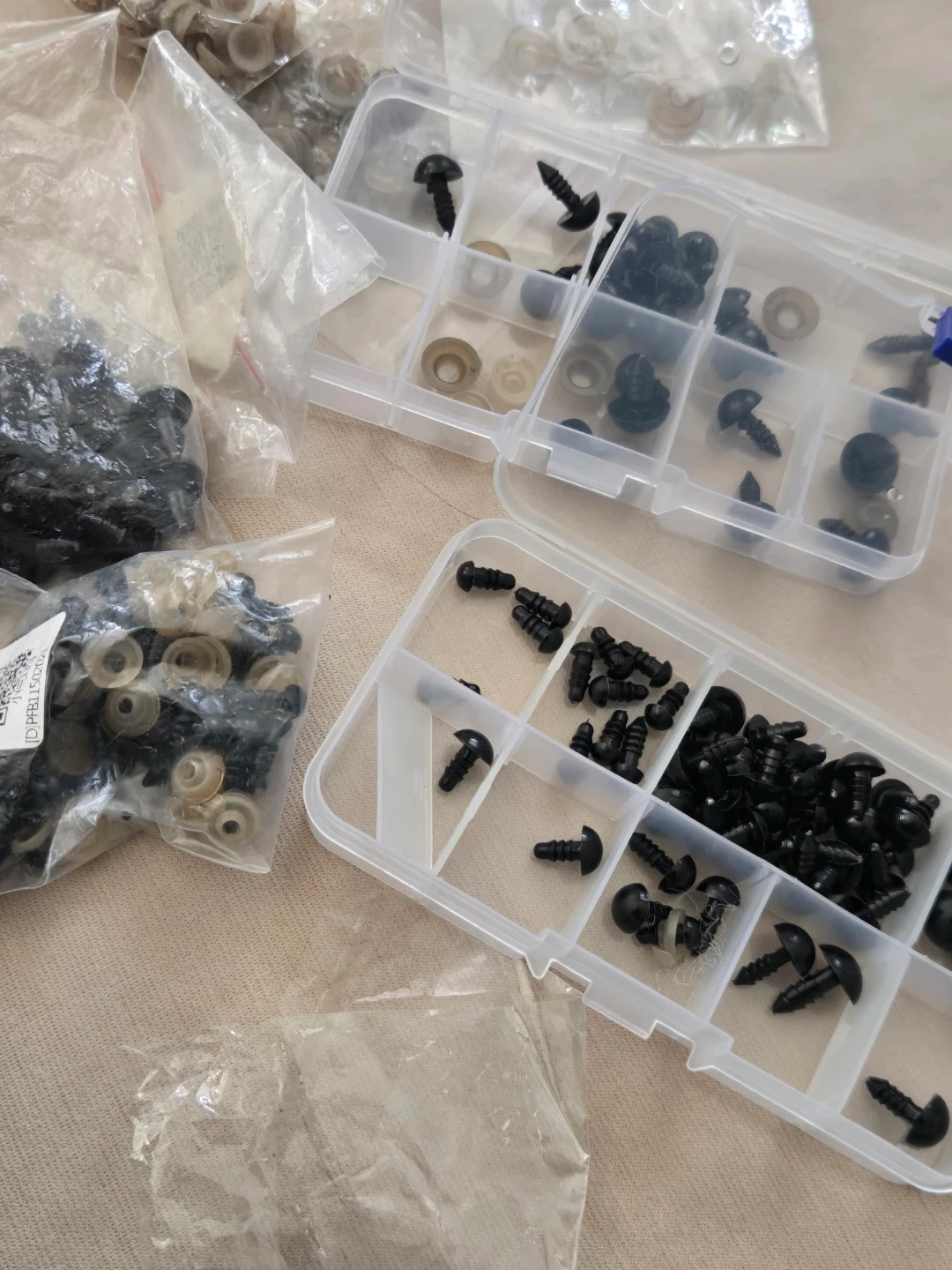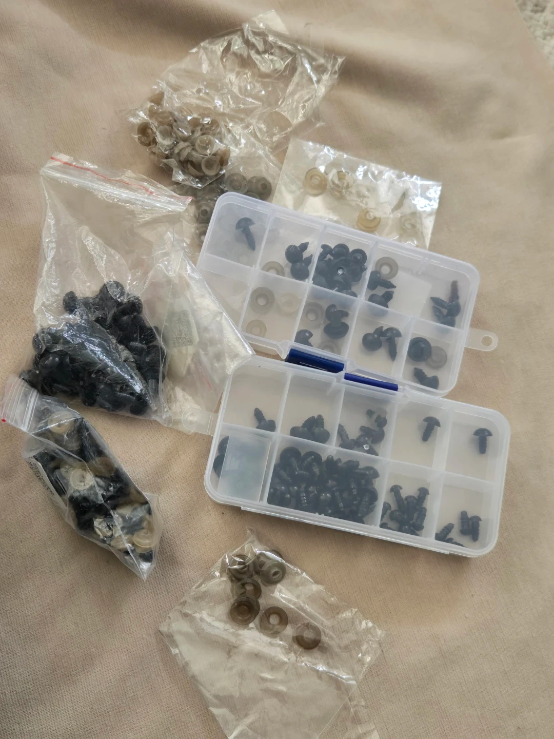 Selling a lot of assorted sizes safety eyes, comes with their matching washers as well as storage container.