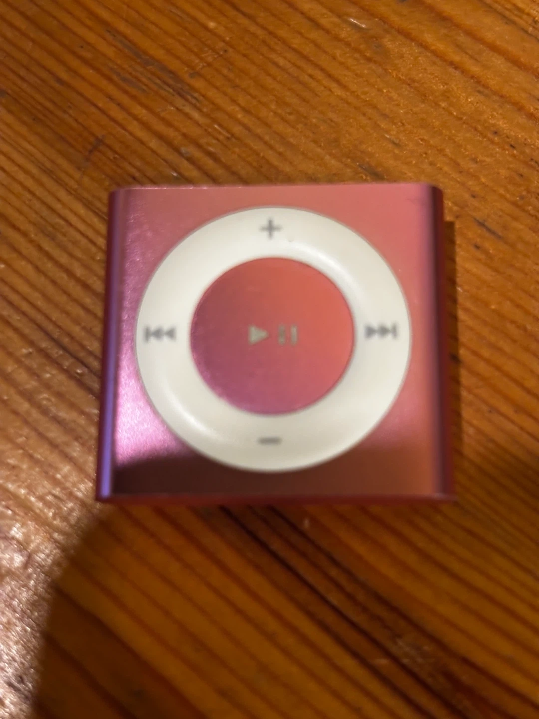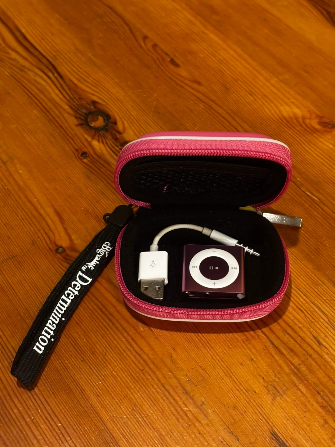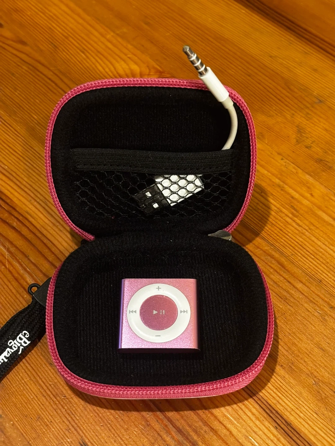 This is a pink Apple iPod Shuffle, 2nd generation. It's a compact MP3 player with a click wheel for navigation. Includes a charging cable and a pink carrying case. Great for workouts!