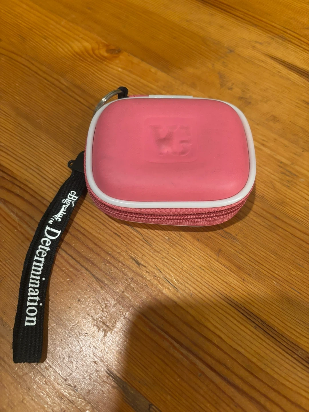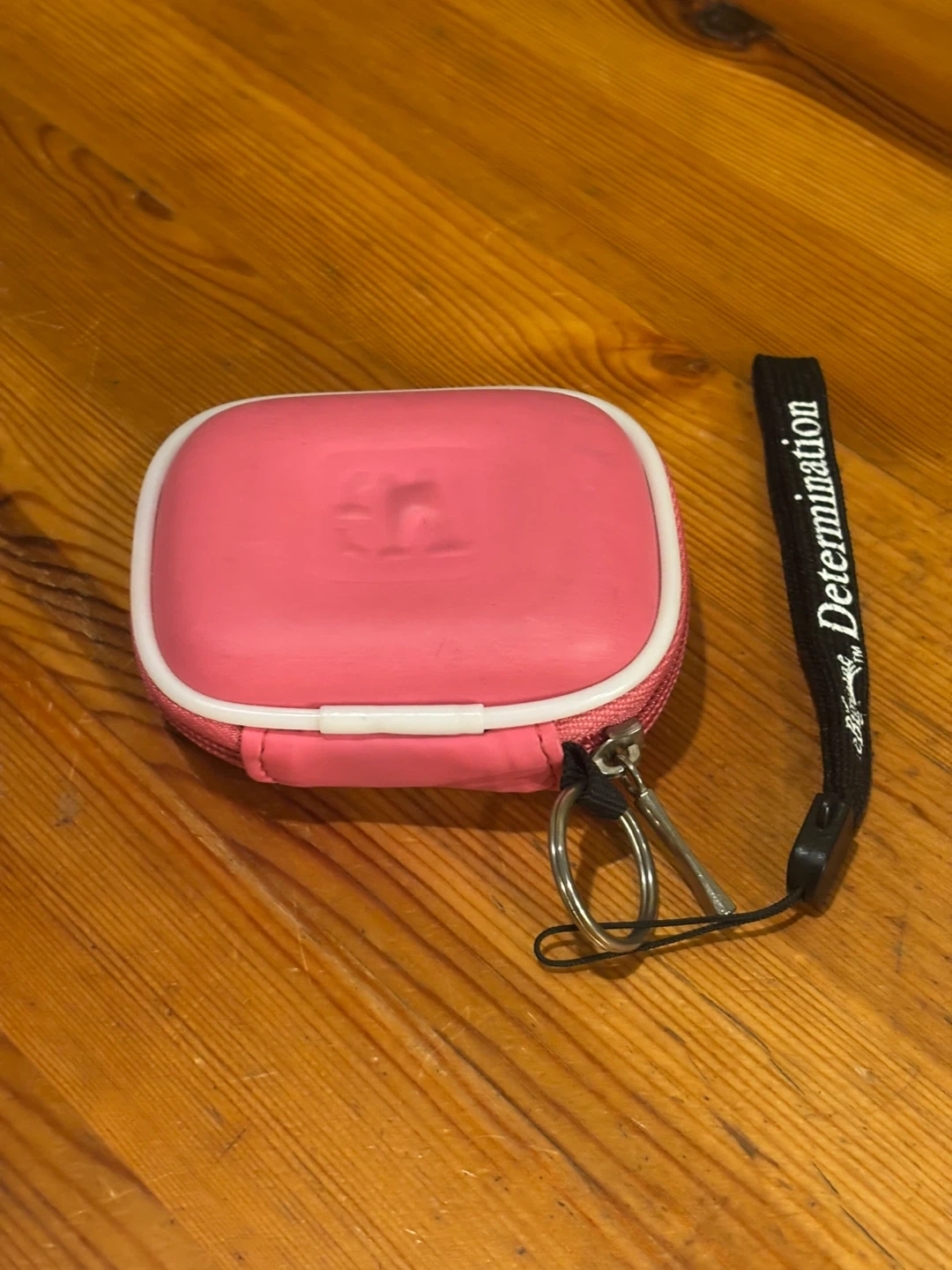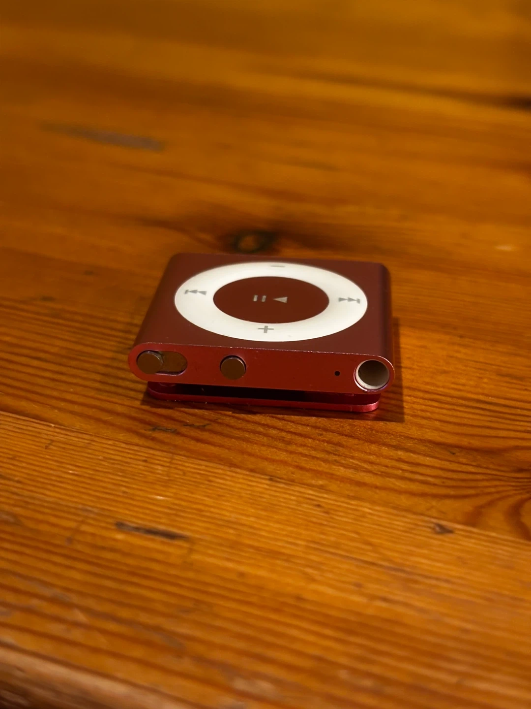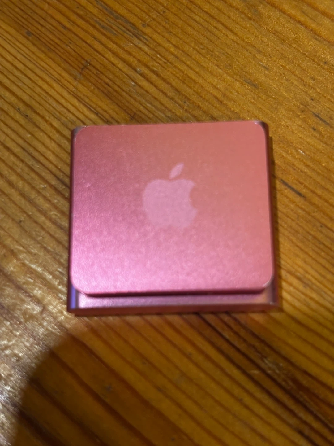 This is a pink Apple iPod Shuffle, 2nd generation. It's a compact MP3 player with a click wheel for navigation. Includes a charging cable and a pink carrying case. Great for workouts!