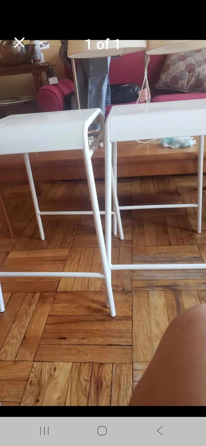 Set of two new white bar stools. 24" Made of metal with a simple, modern design. These stools are perfect for a kitchen counter or bar area! They're easy to wipe clean. Must pick up in
