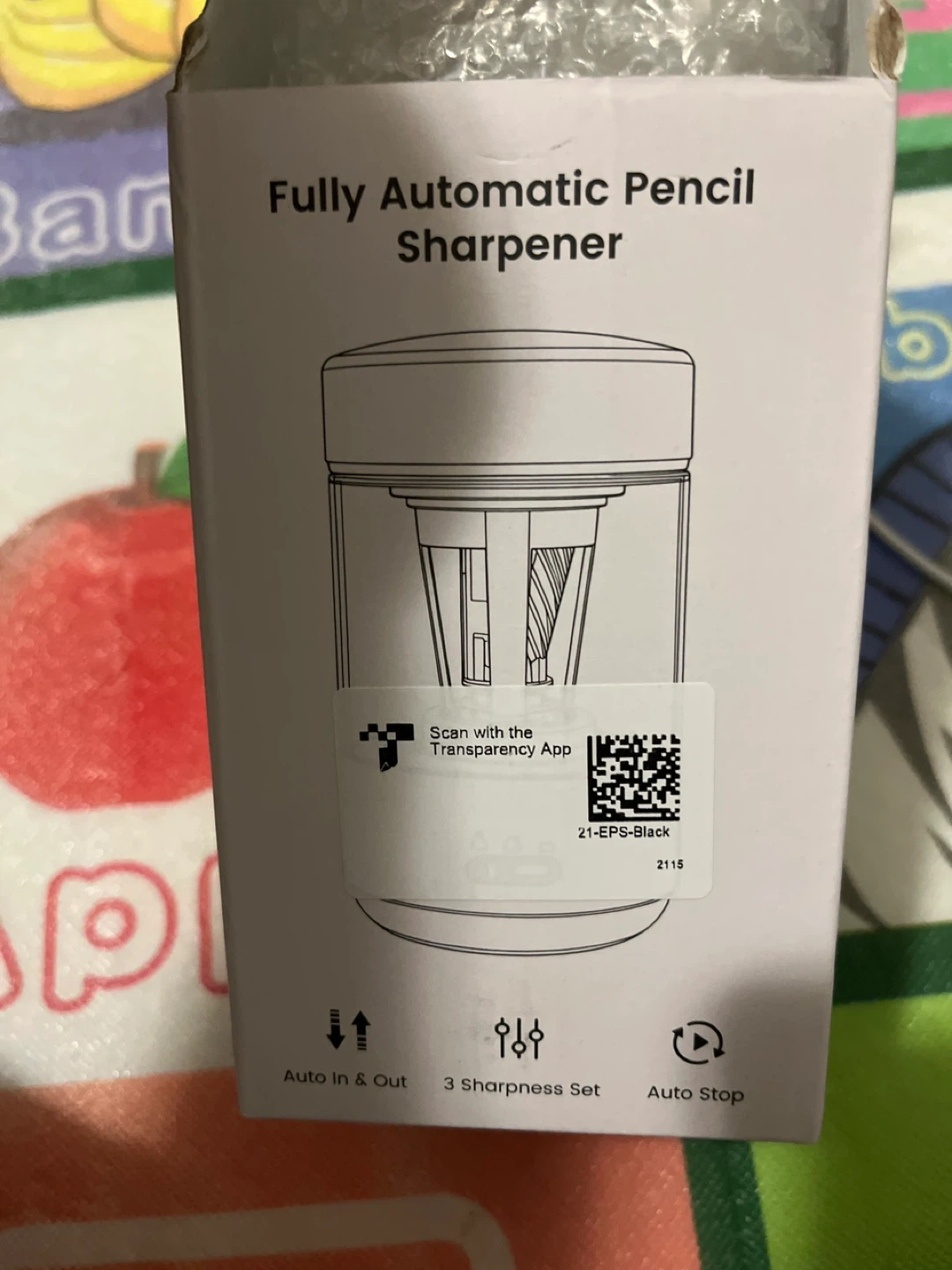 This is a fully automatic pencil sharpener. It features auto in & out, 3 sharpness set, and auto stop. It's black and comes in the original box.