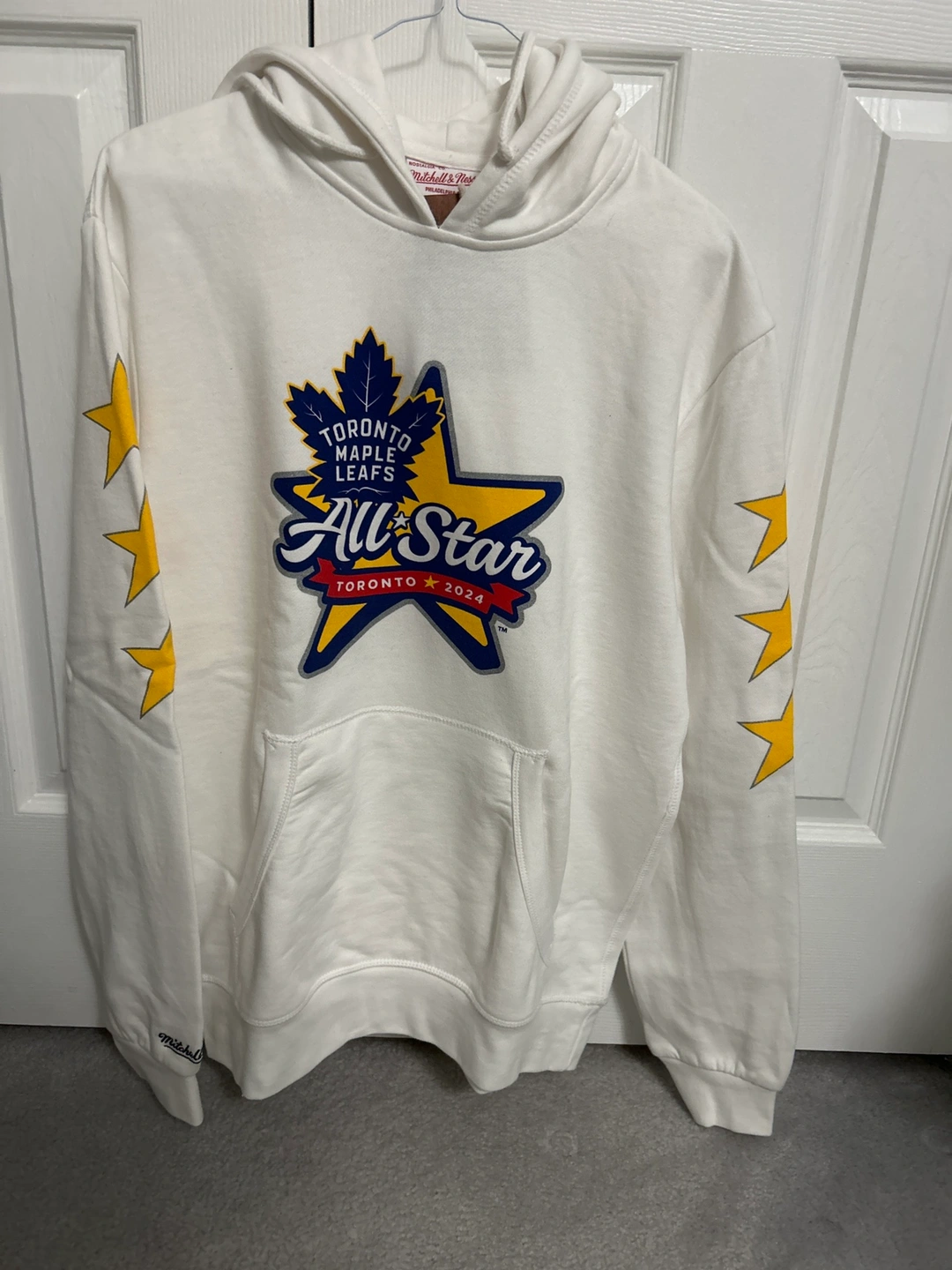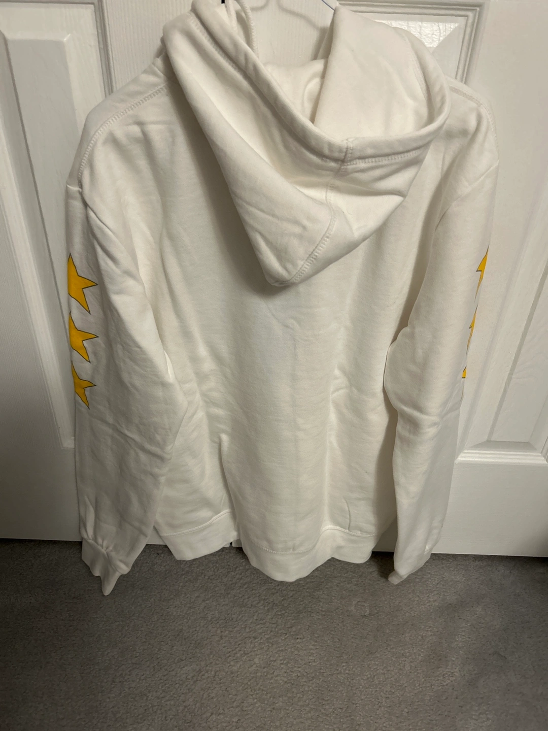 Large size white hoodie with yellow star detailing on sleeves and front.