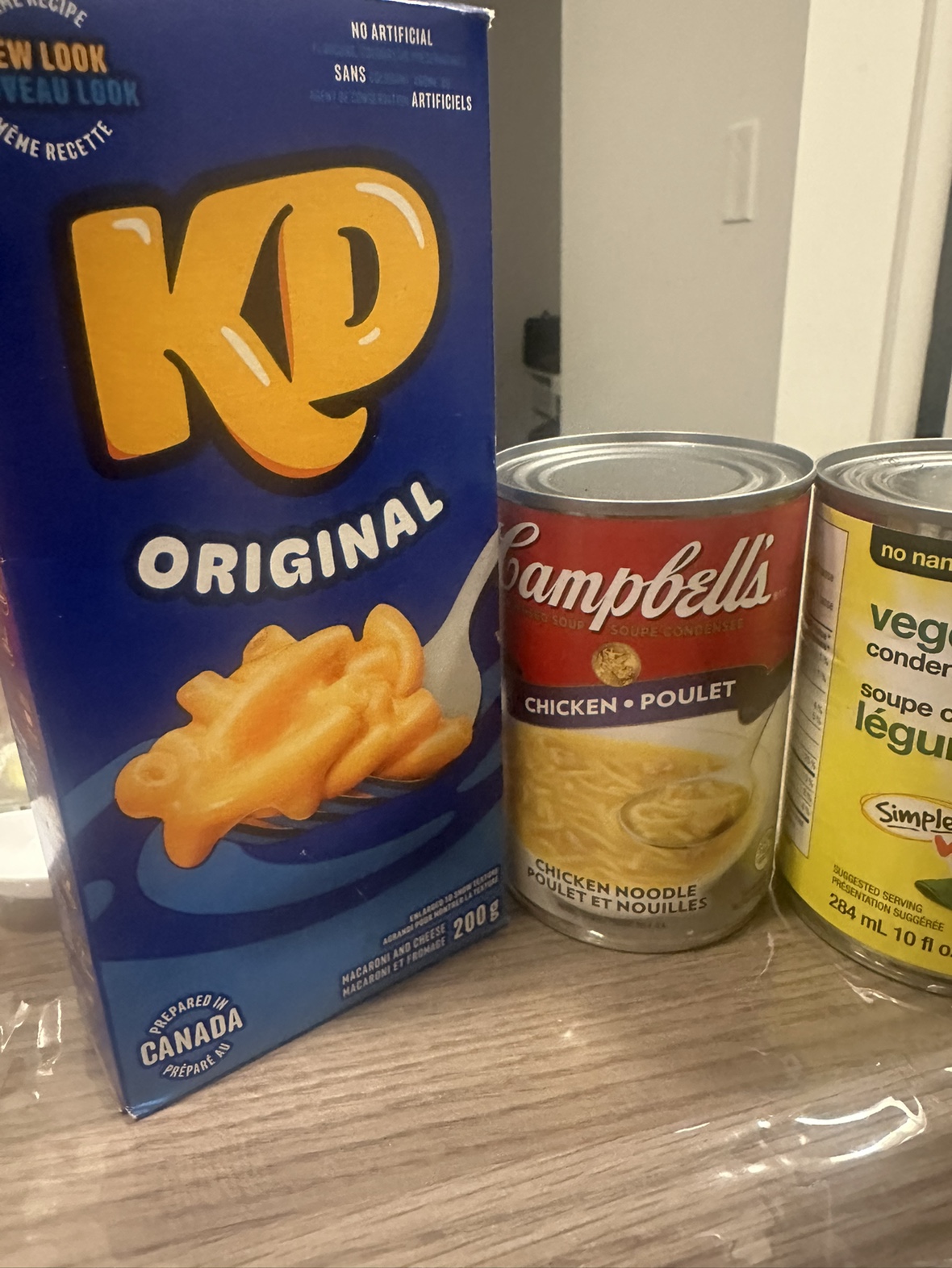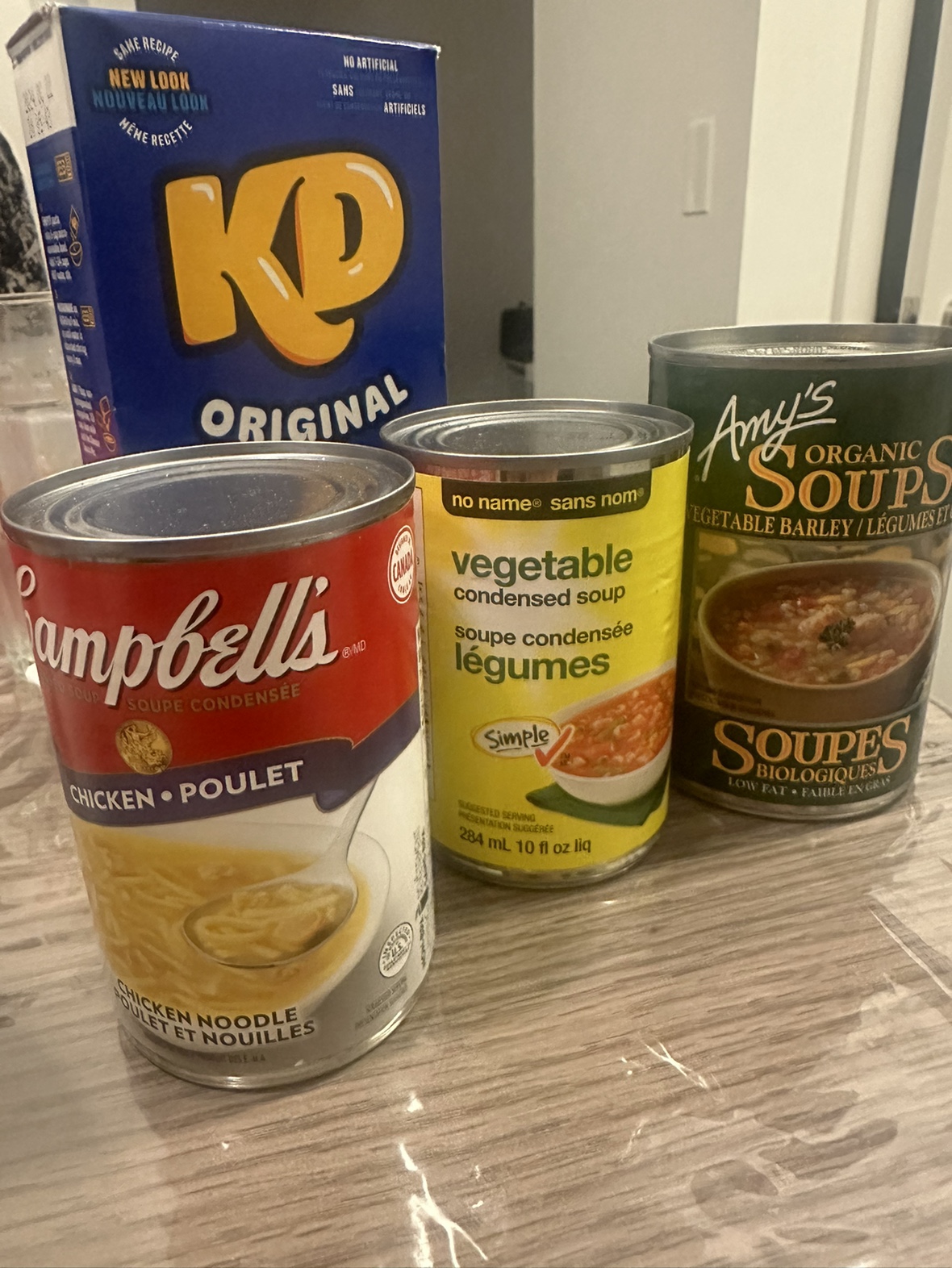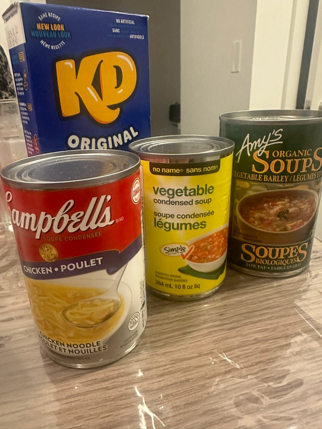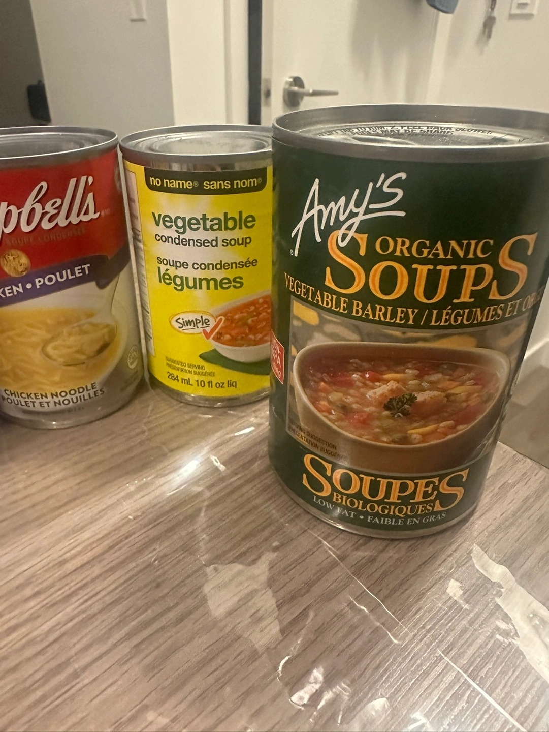 Three cans of soup. One is Campbell's Chicken Noodle, one is no-name vegetable, and one is Amy's Organic Vegetable Barley.