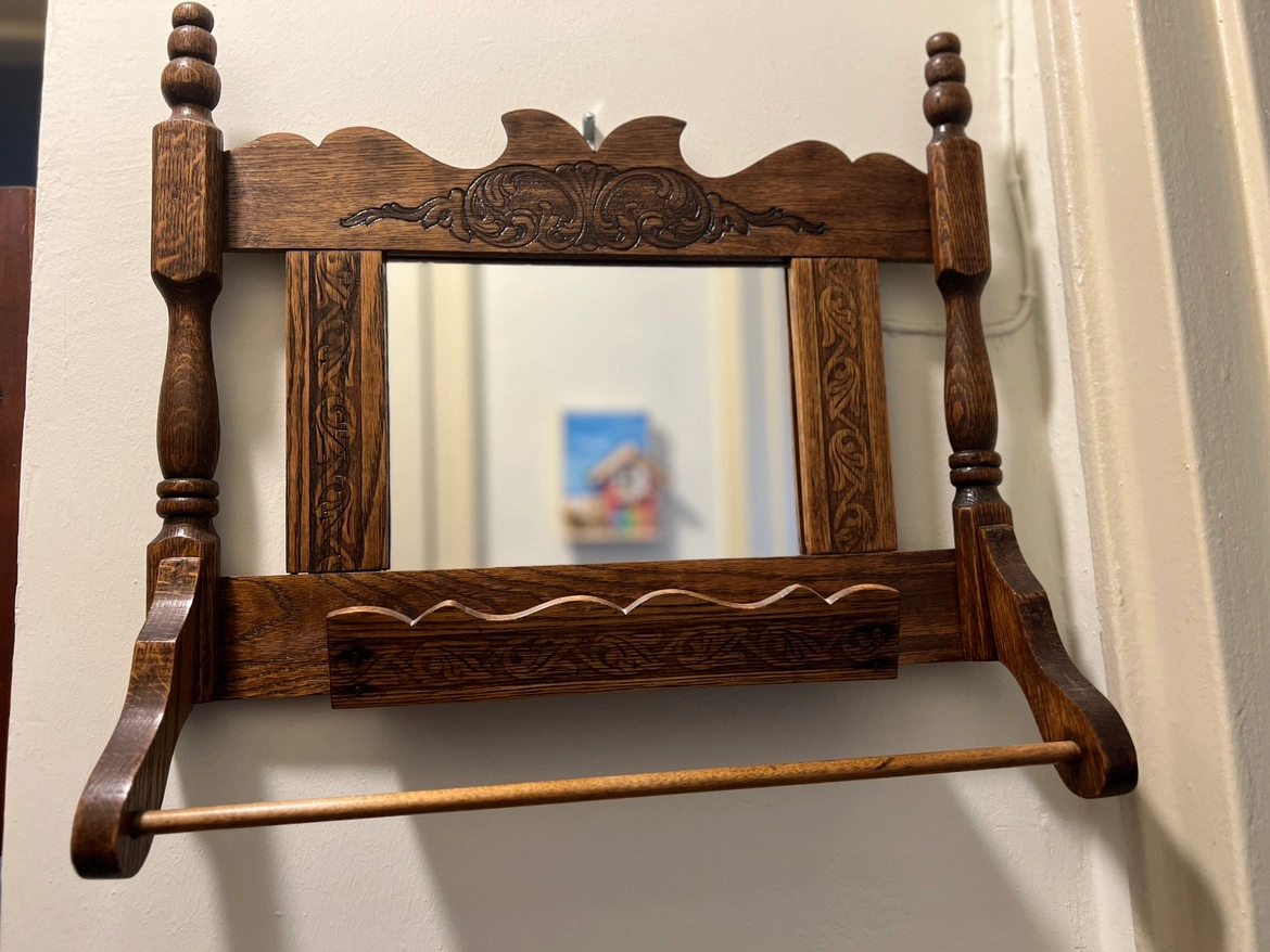 This is a wooden wall mirror with a shelf and a towel rack. The mirror is framed with intricate carvings and the shelf and towel rack are made from the same wood.