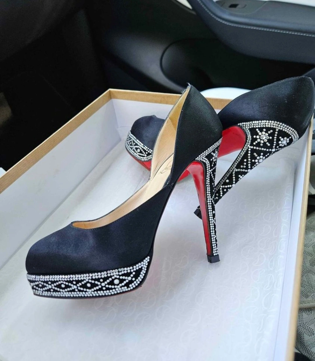 2 pairs of platform shoes with crystal embellishments.