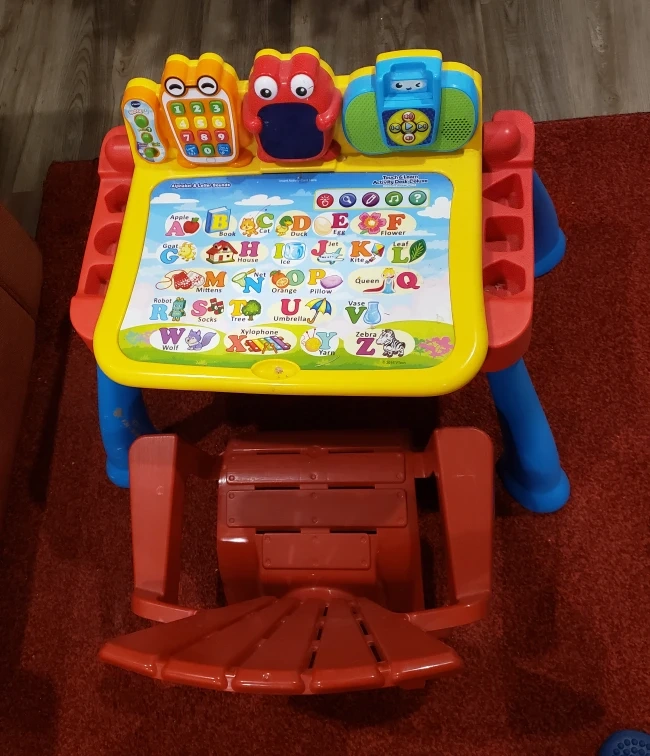 This is a colourful play set that is perfect for young children. The desk has a variety of activities and games that will help them learn their ABCs. The chair is sturdy and comfortable.