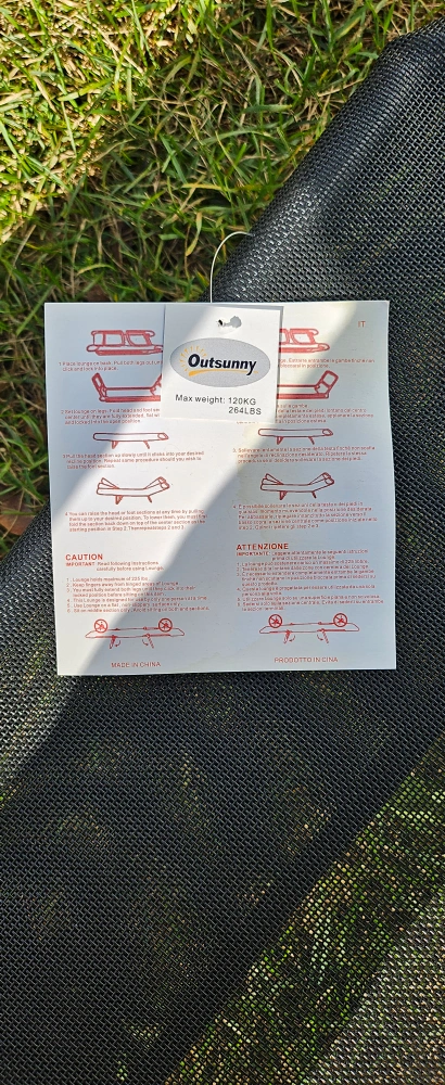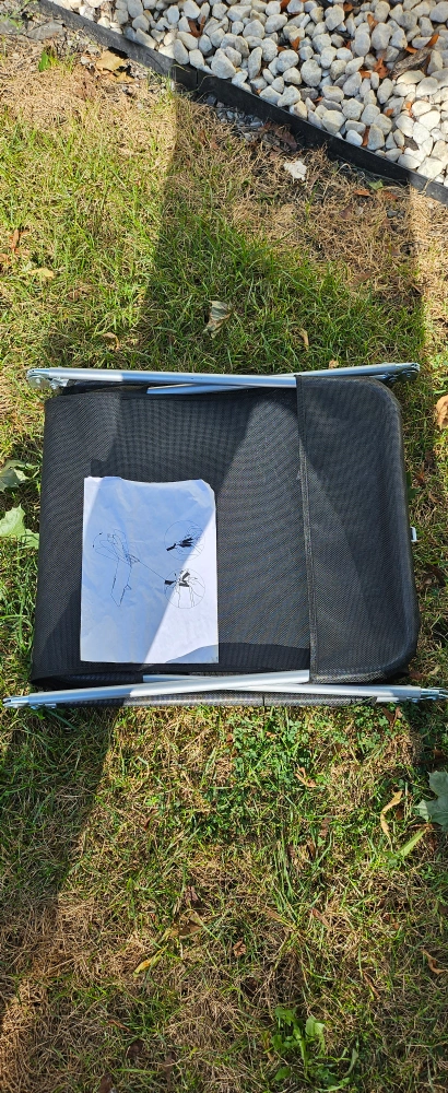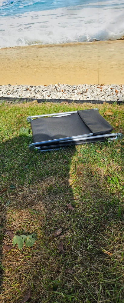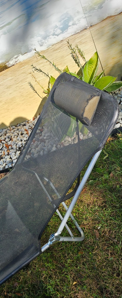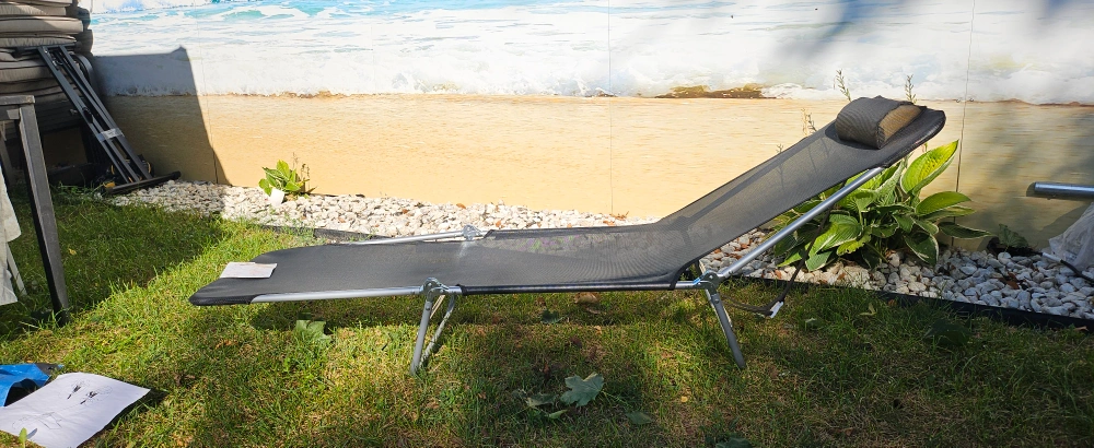 A folding lounger with a black mesh seat and aluminum frame. The lounger is in new condition and folds up for easy storage. It is perfect for relaxing in the backyard or at the beach.