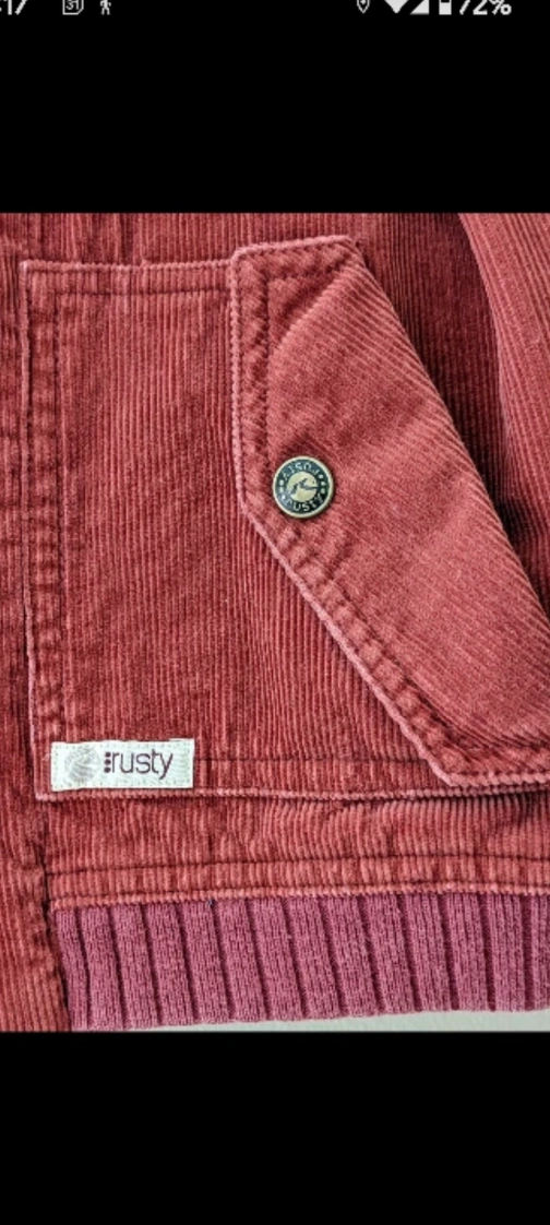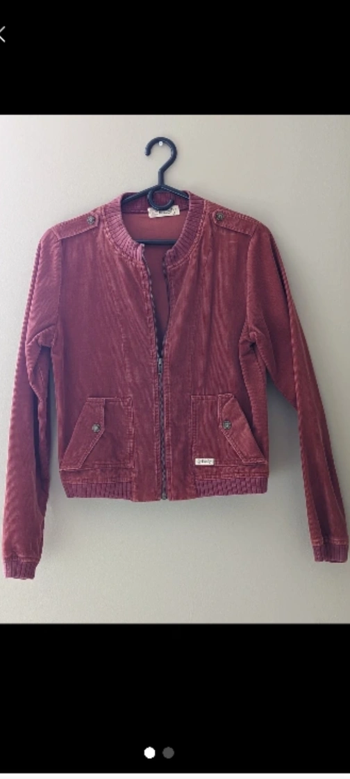 *Women's size medium, burgundy coloured corduroy jacket with zipper closure and two front pockets*