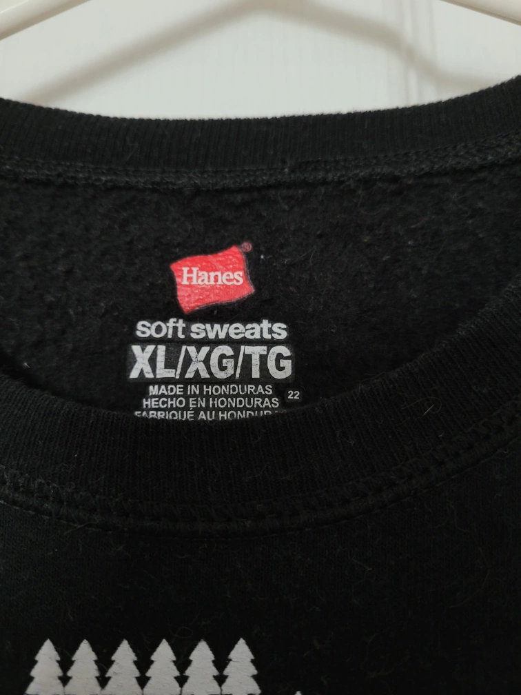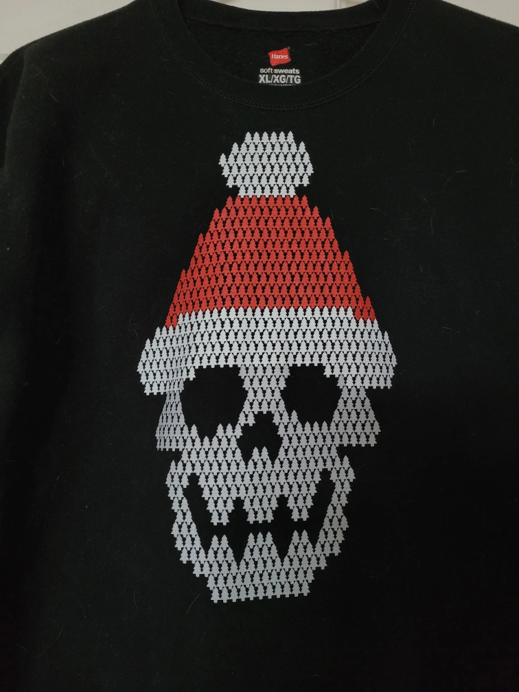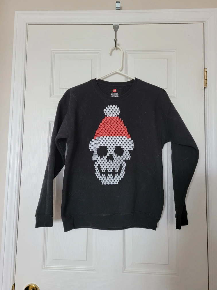 Black Christmas sweater with a white skull wearing a red Santa hat. It is a size XL youth, but will fit an XS women's.