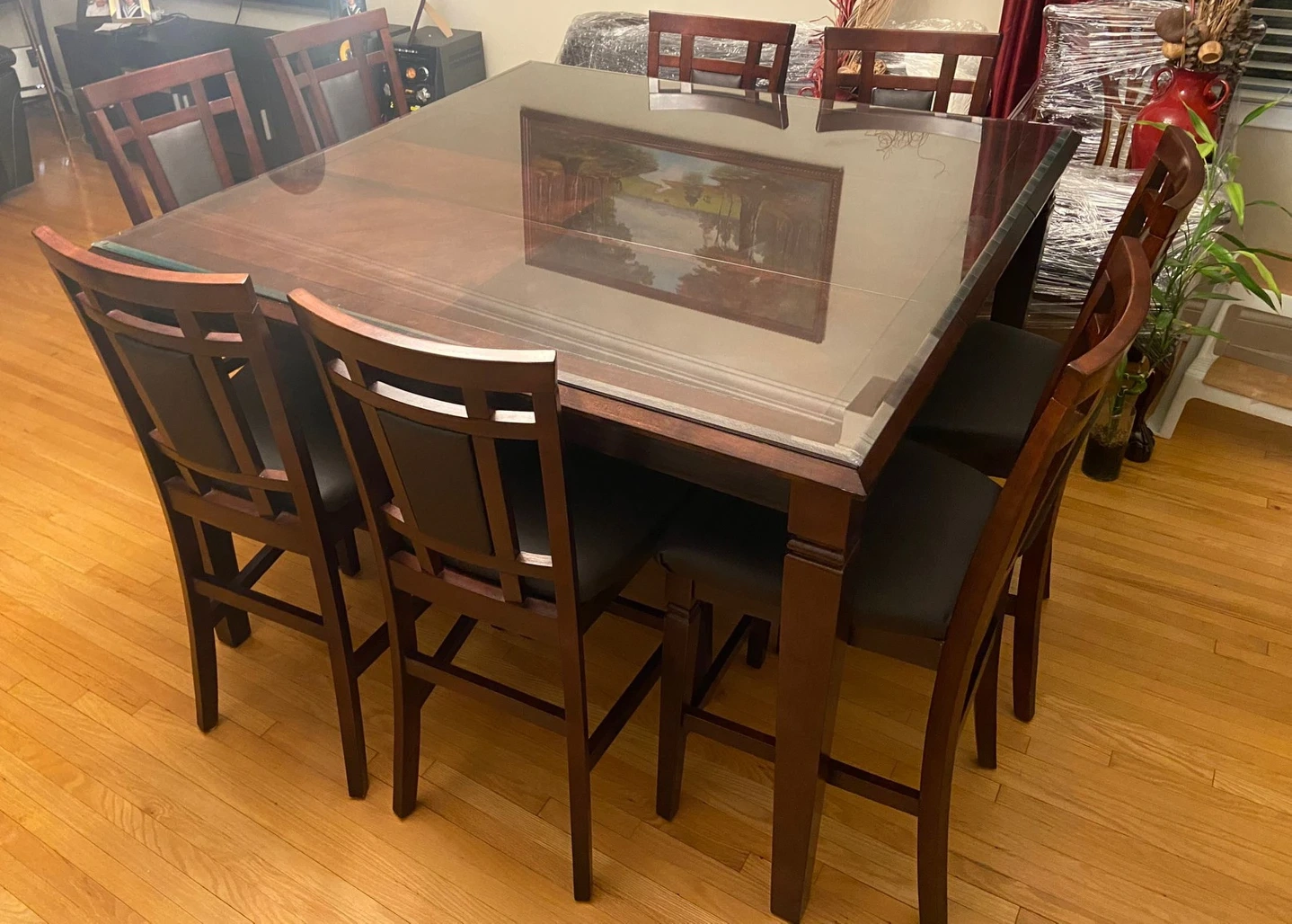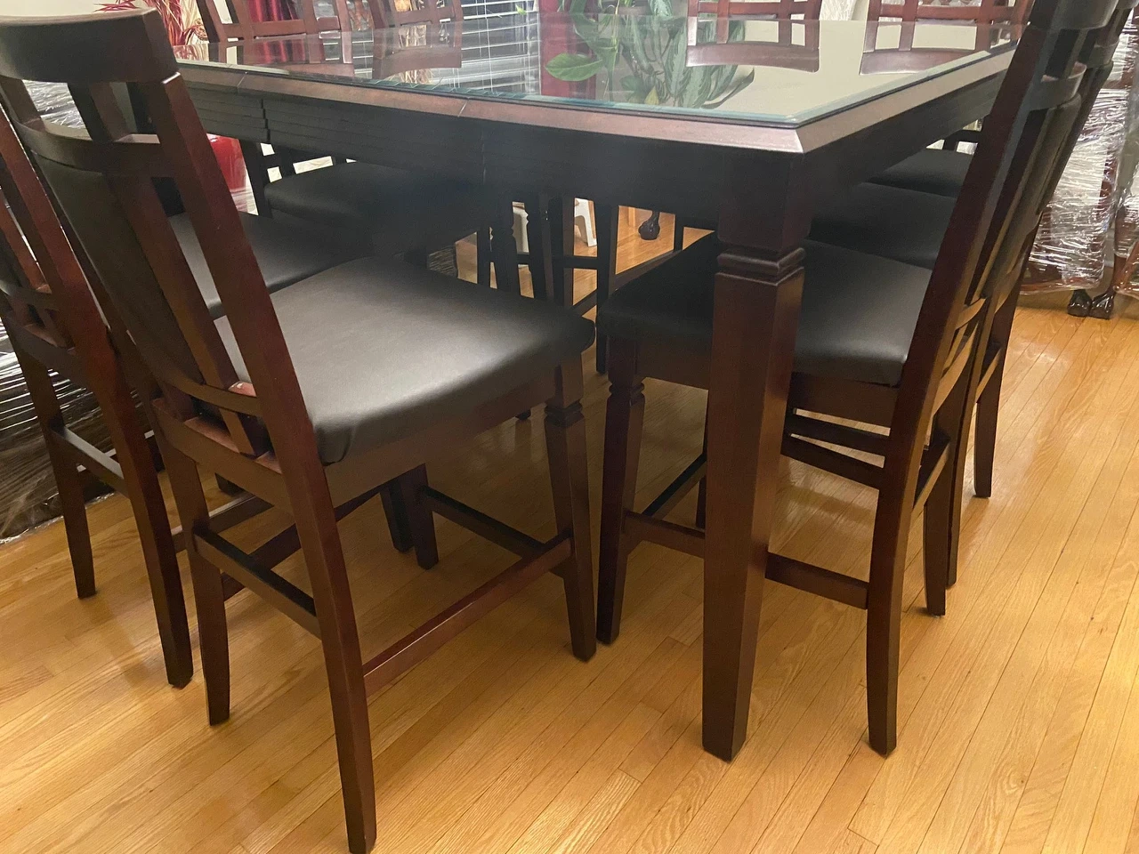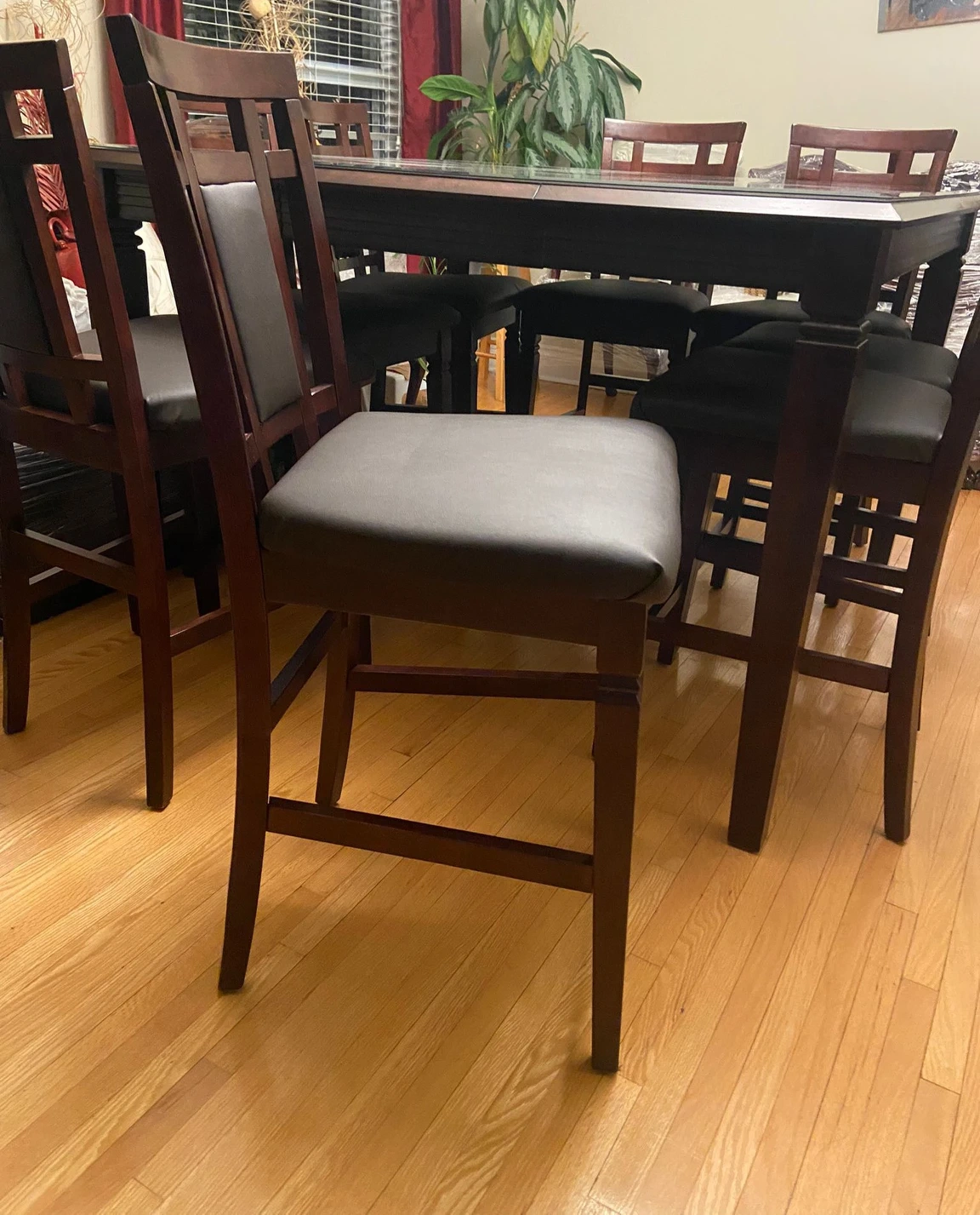 Selling a Solid Wood Dining Set with fox leather seats. Originally paid $2200+ for the dining set NOT including the tempered glass top which we purchased separately at a custom fit for $300.