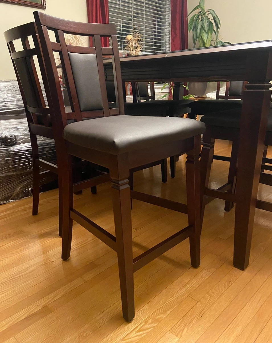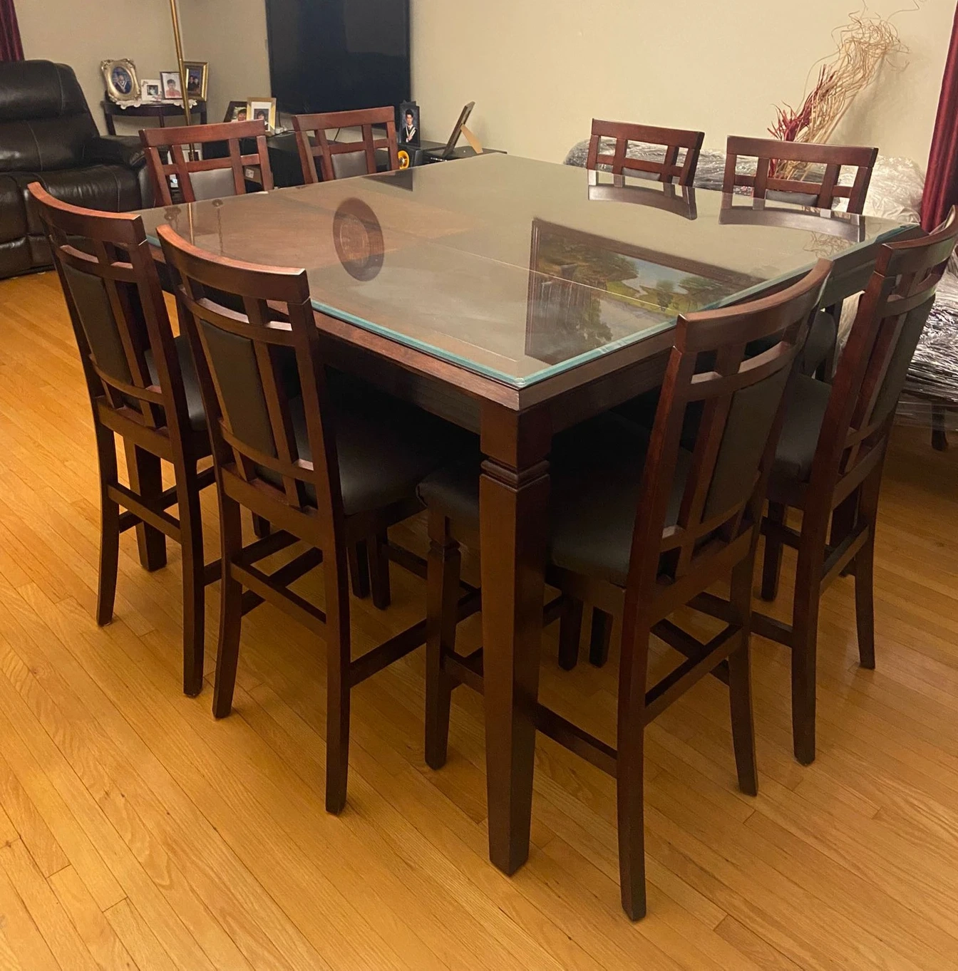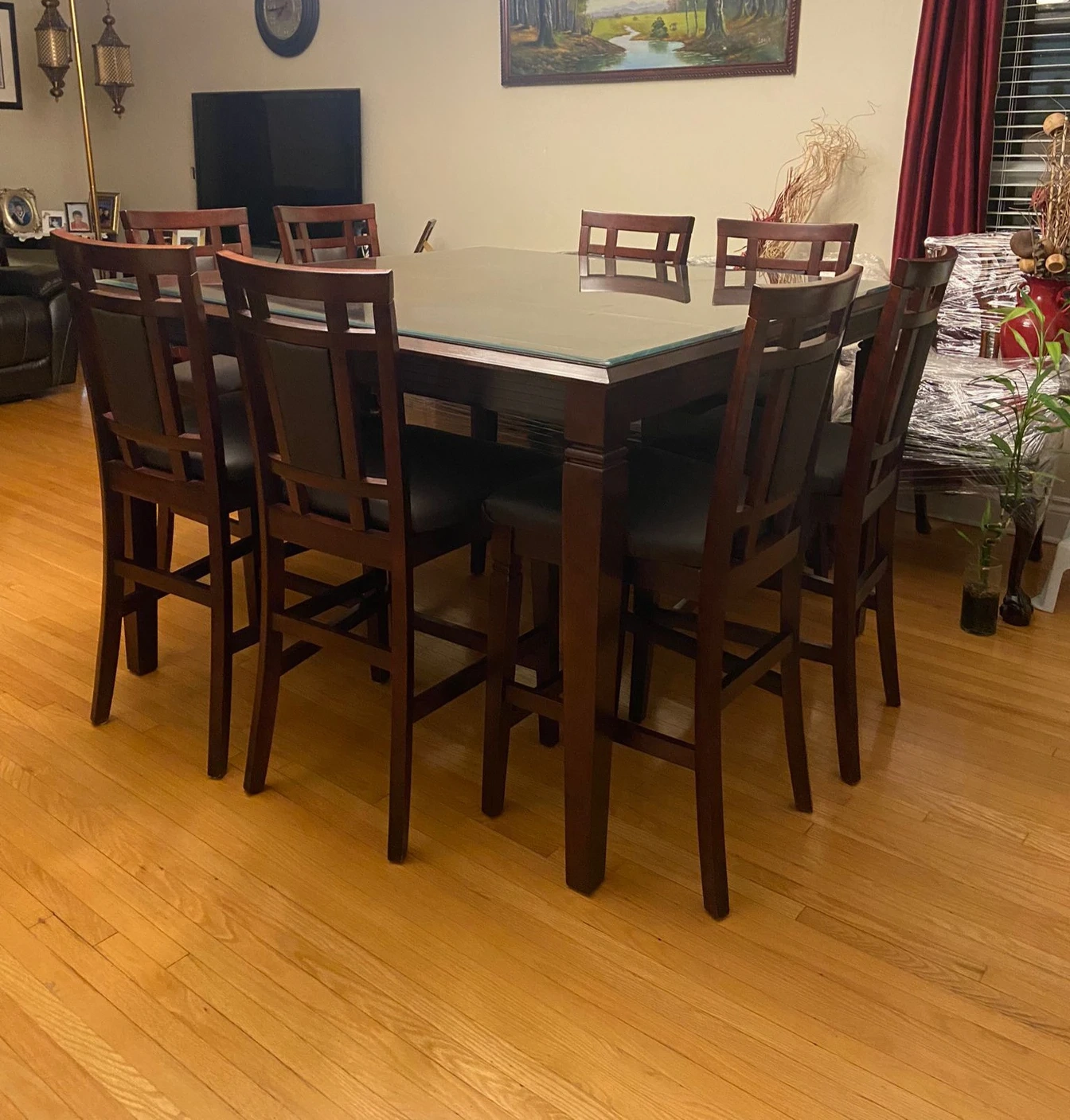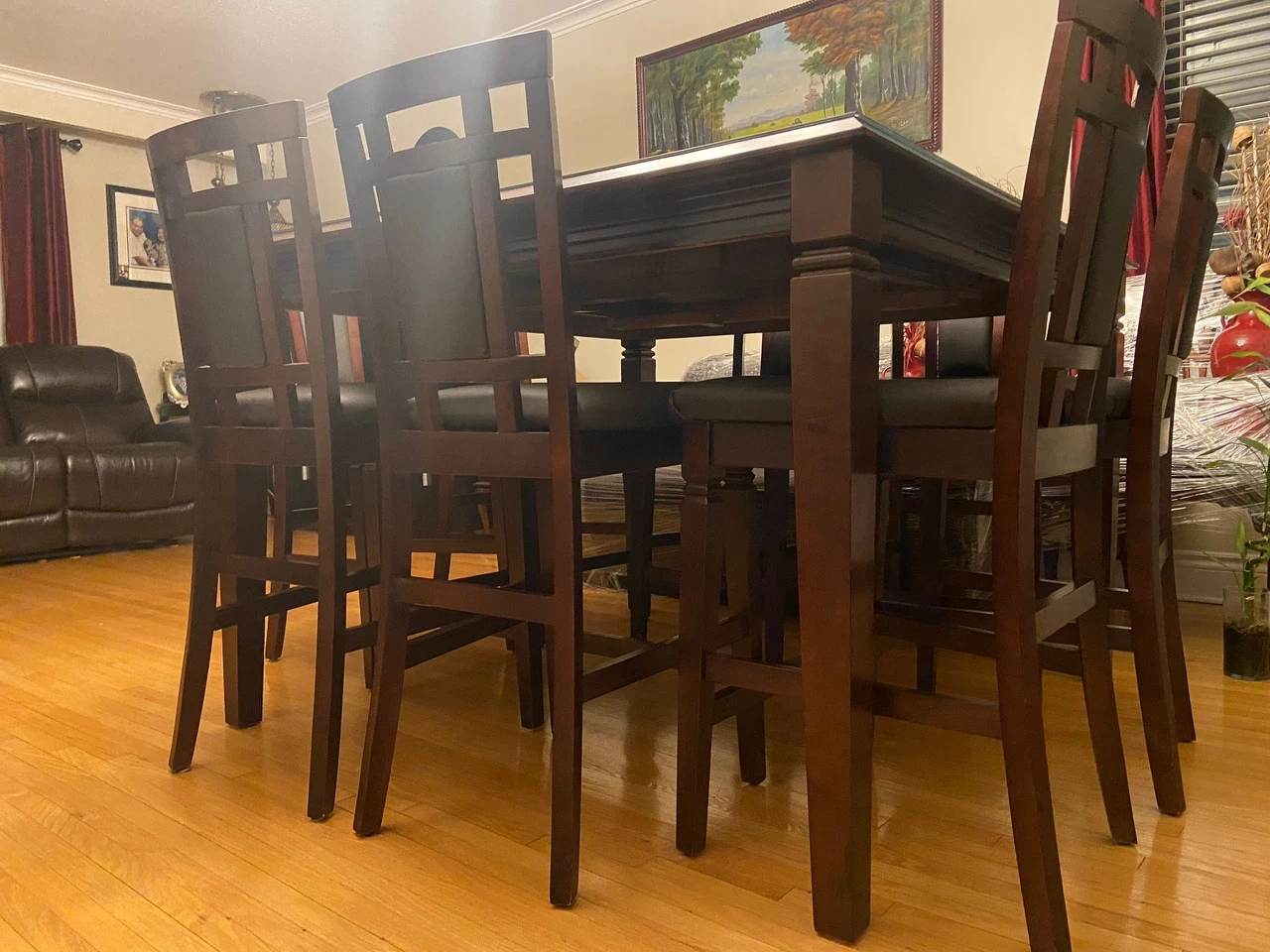 Selling a Solid Wood Dining Set with fox leather seats. Originally paid $2200+ for the dining set NOT including the tempered glass top which we purchased separately at a custom fit for $300.