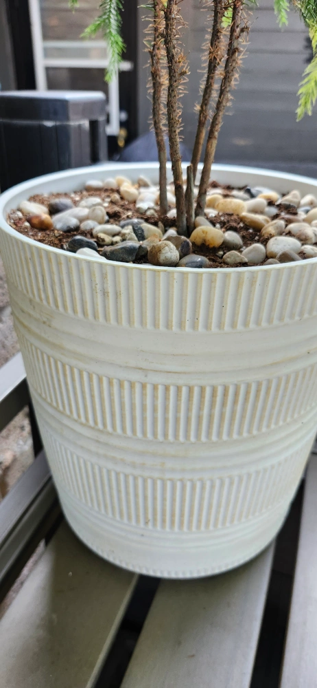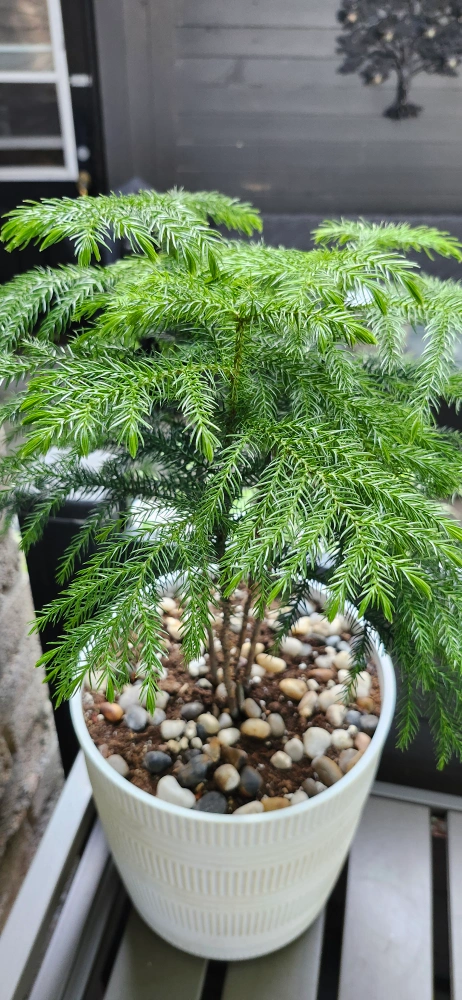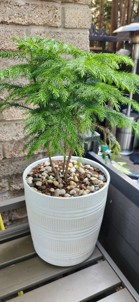 A Norfolk Island pine in a white pot with decorative stones. The plant with pot is approximately 2 feet tall.