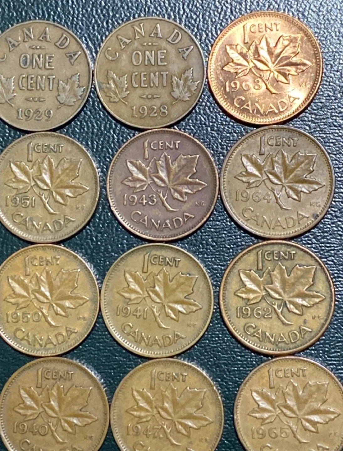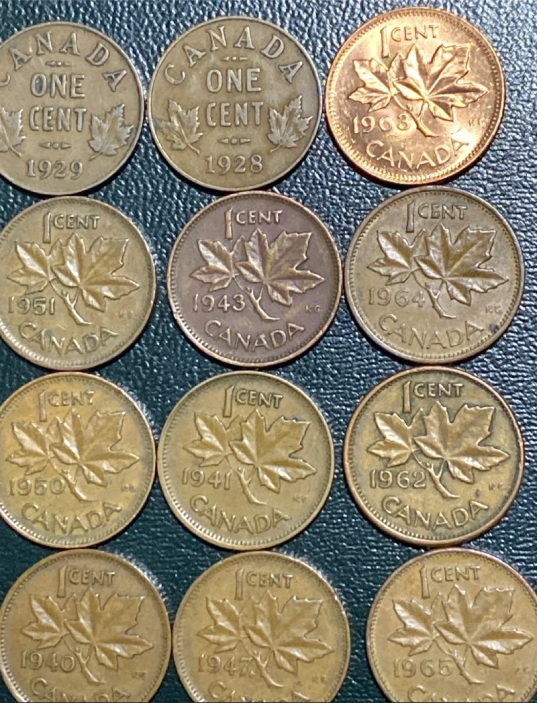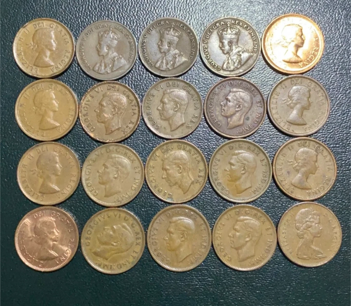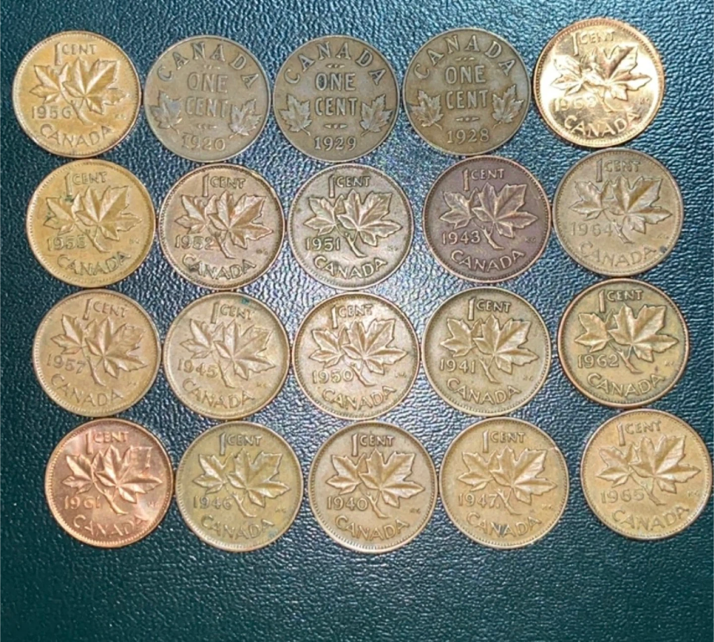 This is a collection of 20 Canadian pennies, spanning various years. All coins are 1 cent denominations. Most coins feature the maple leaf design on the reverse. Years range from the 1920s to the 1960s.