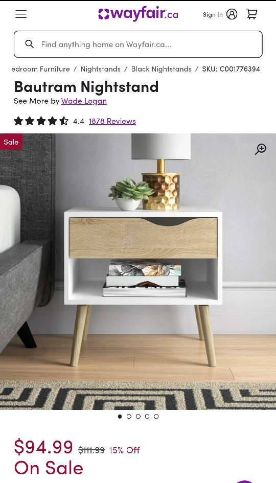 Set of two nightstands with one drawer each and a lower shelf, retails for $215 with taxes.