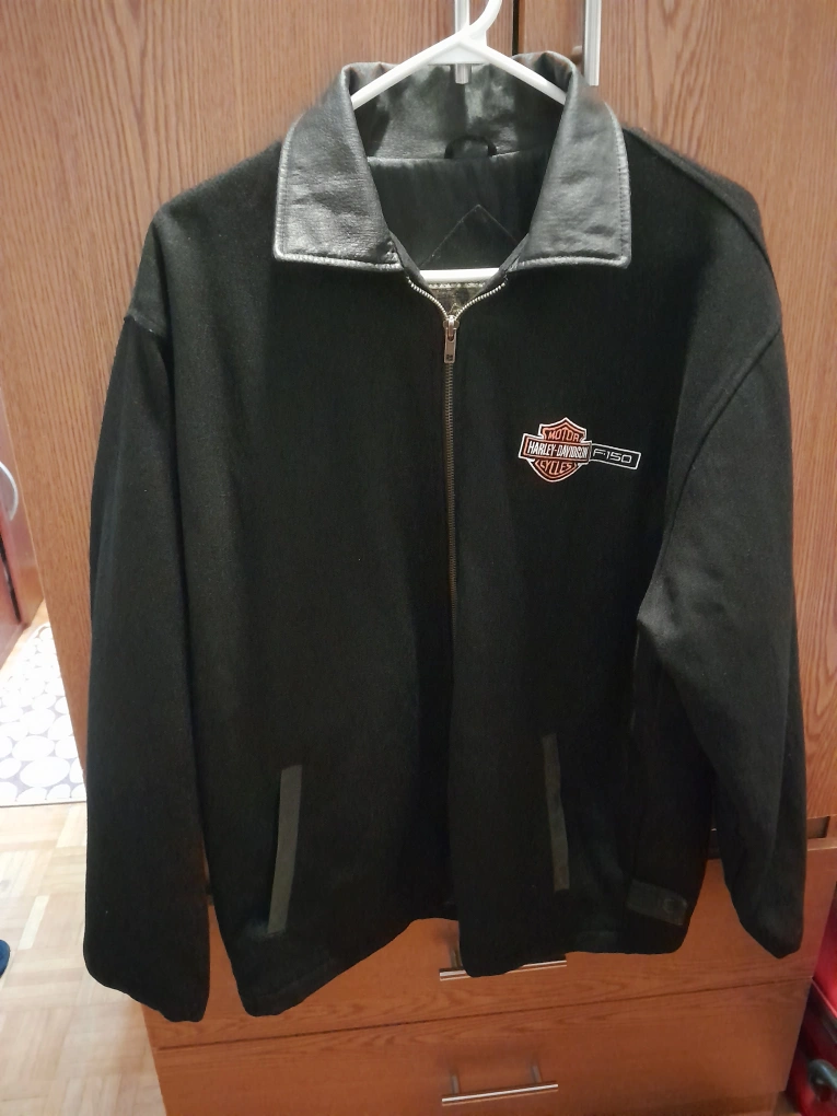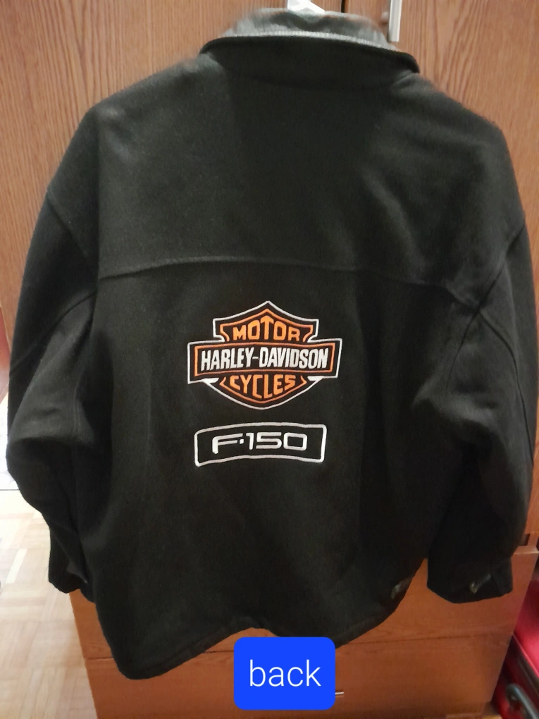 Men's size medium jacket with a black wool exterior, leather collar and zipper closure. The jacket features a Harley Davidson logo on the front and back, as well as a "F150" patch on the back. The inside lining is a soft fabric. There are two pockets on the front of the jacket and also inside. My friend dont use it anymore so he wants to sell it in a cheaper price. It was kept neatly so it is in good condition.