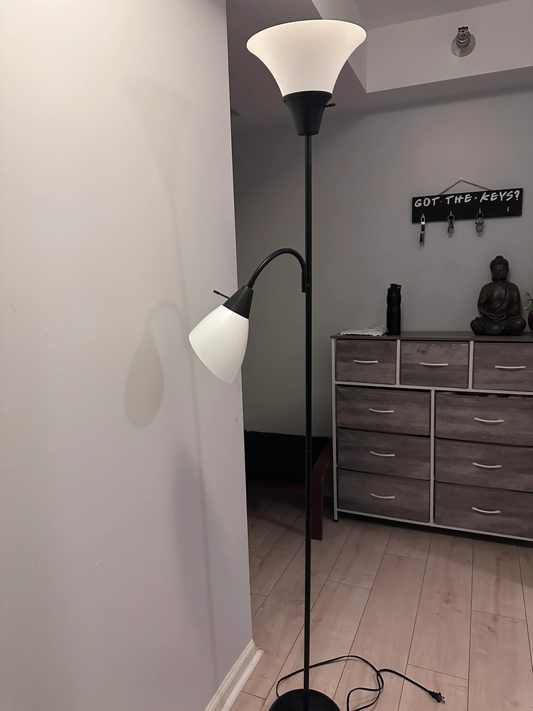 Black floor lamp with a reading light and two lampshades. Adjustable height and 3 color modes. The lamp is in excellent condition, unused.