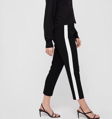 These are a great pair of pants. They are black with a white stripe down the side. Aritzia Babaton Dexter black pants white stripes