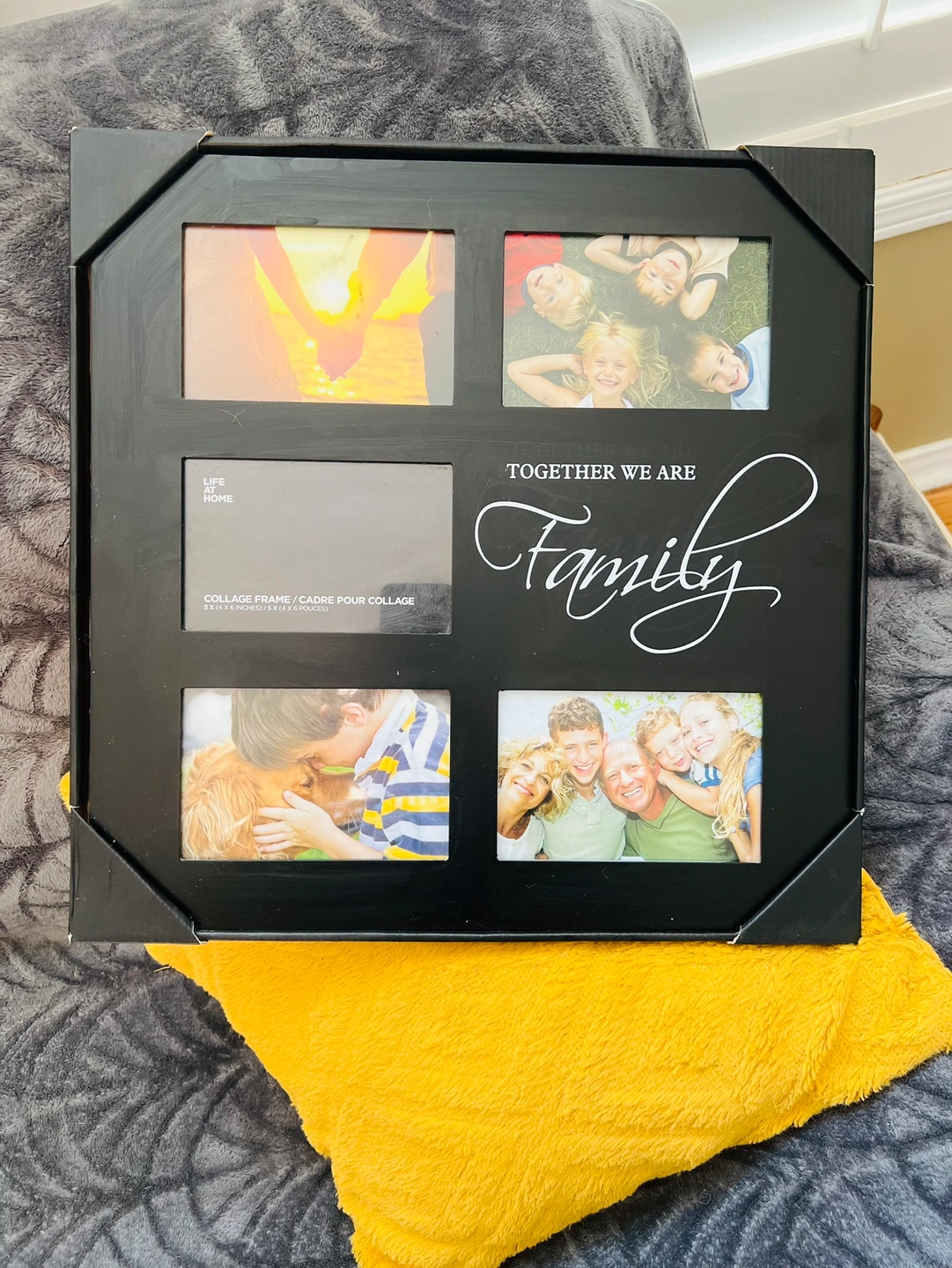Black picture frame with the words "Together we are family" on it. It is designed to hold five 4 by 6 photos.