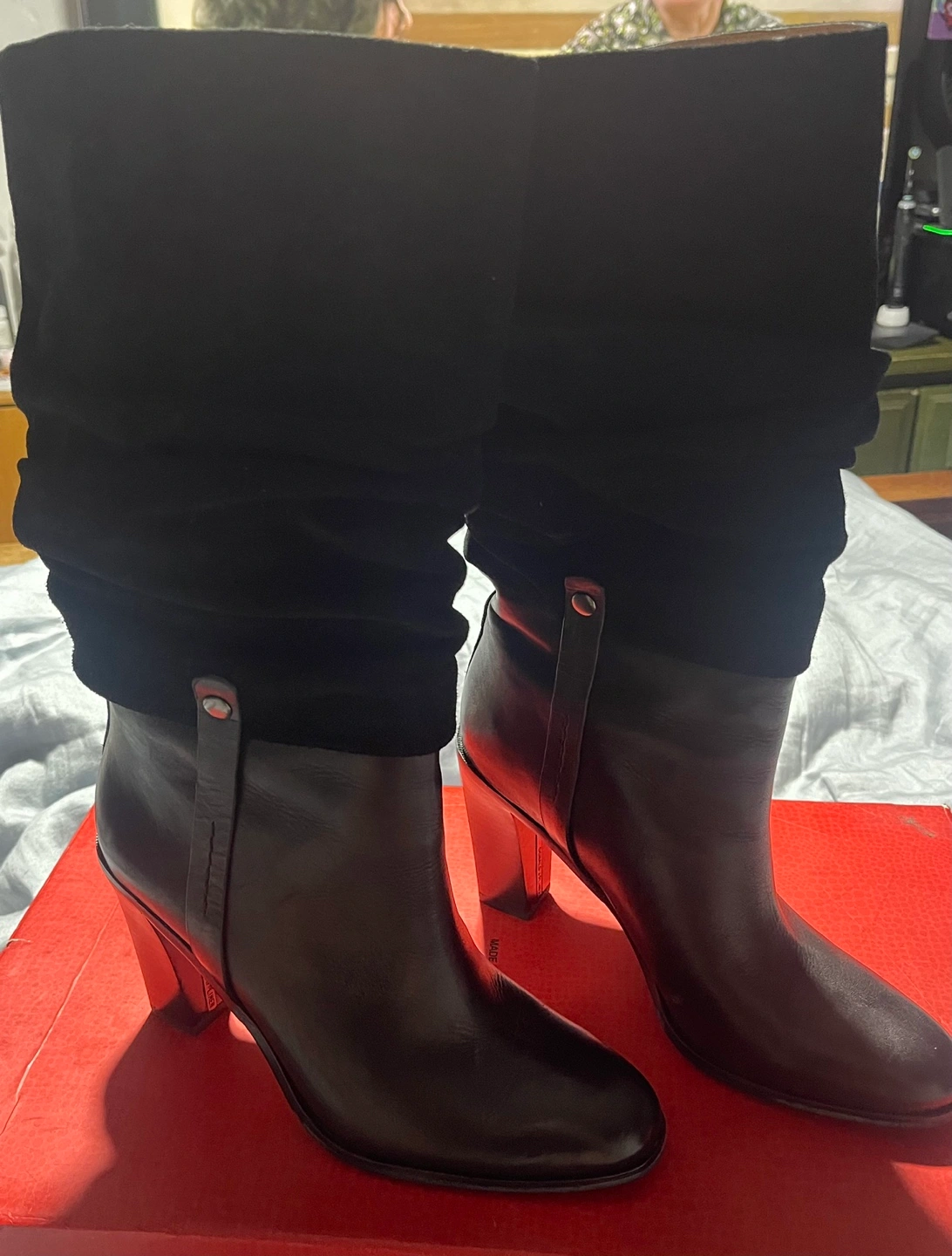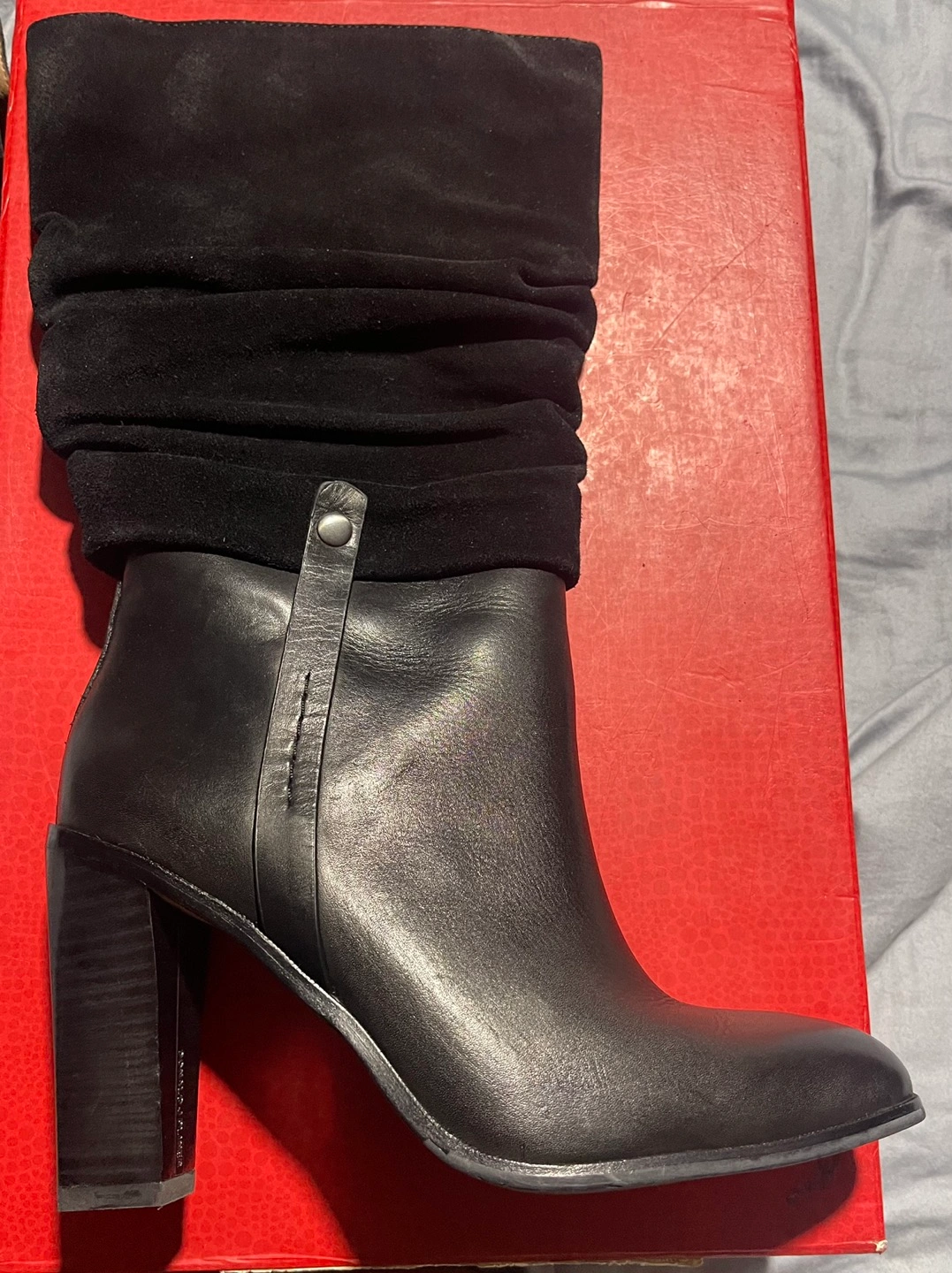 Details: Genuine oily Suede slouch upper designed, sewn to have a scrunched look. Smooth and soft Leather on the lower boot.