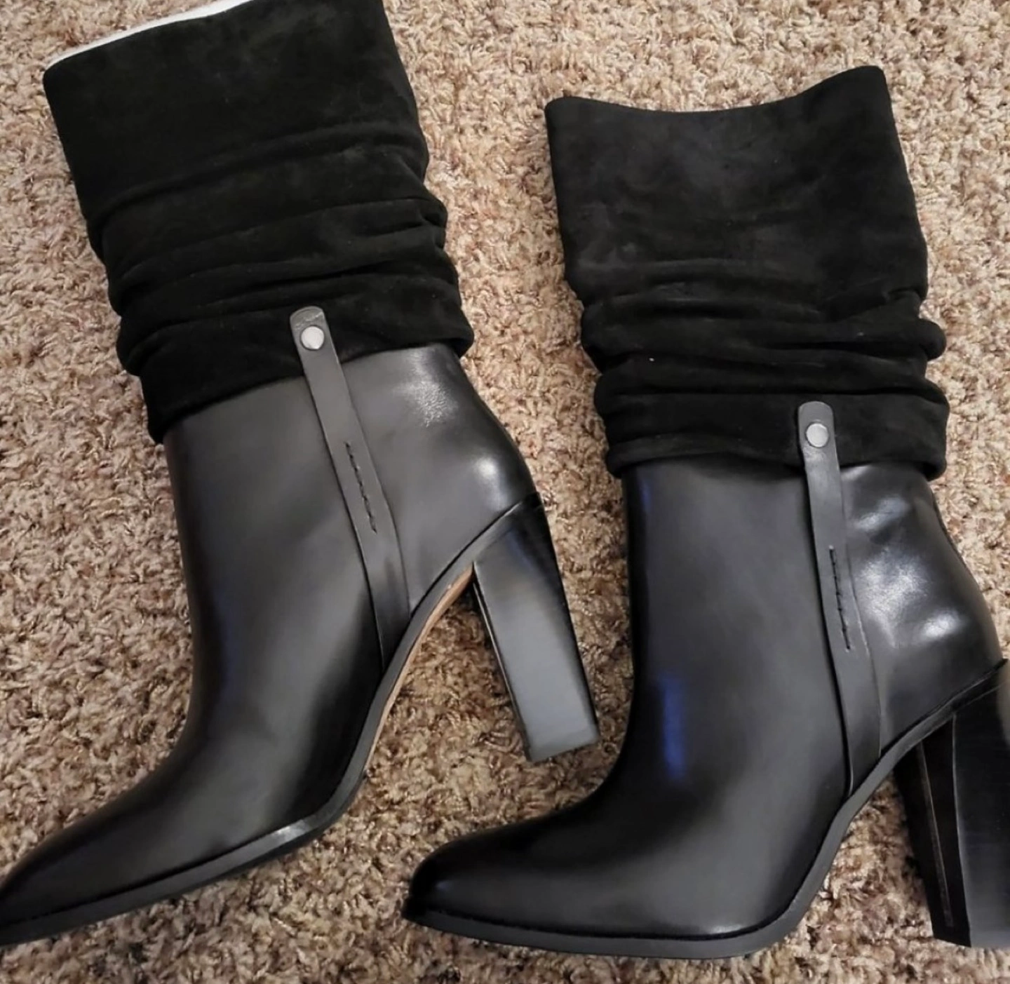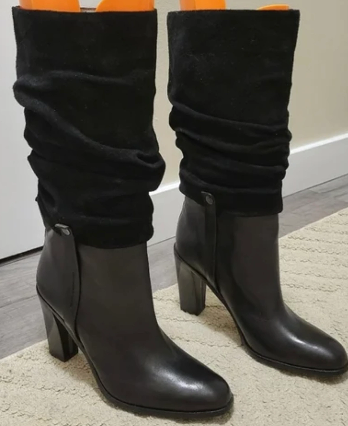 These, boots have a rounded toe. It is a mid-calf boot that is tapered to keep a sleek and feminine look, while the relaxed, slouched shaft plays up to a modern look. The block heel allows ease of wear and adds to the silhouette and design of these stylish and classy boots. A Beautifully made boot that will receive many compliments. Perfect for the up coming fall weather. A Must add to your wardrobe!