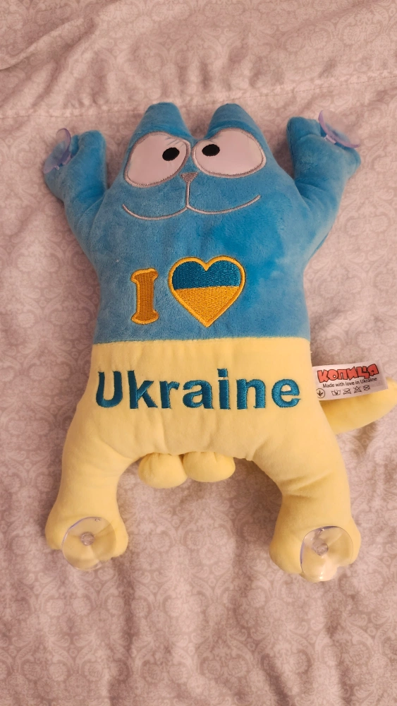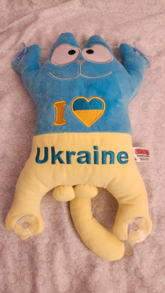 This is a novelty/humerous plush toy cat with the words "I Love Ukraine" and a Ukrainian flag heart on its chest. It has suction cups on its hands and feet.