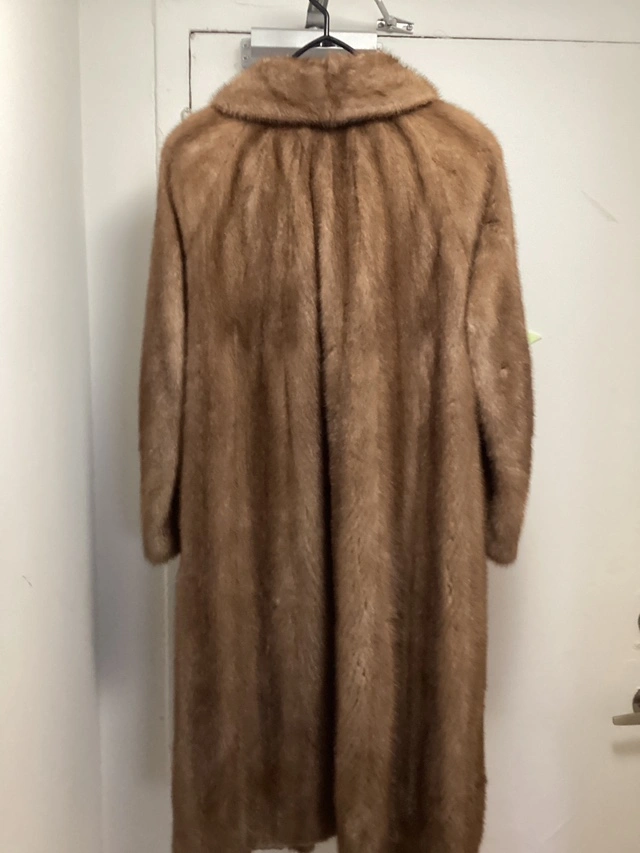 Brown mink fur coat. The coat has a collar and is lined. The coat has a few button closure clasps. The coat is approximately knee length. In excellent condition. Look like a movie star this winter with this fabulous coat!