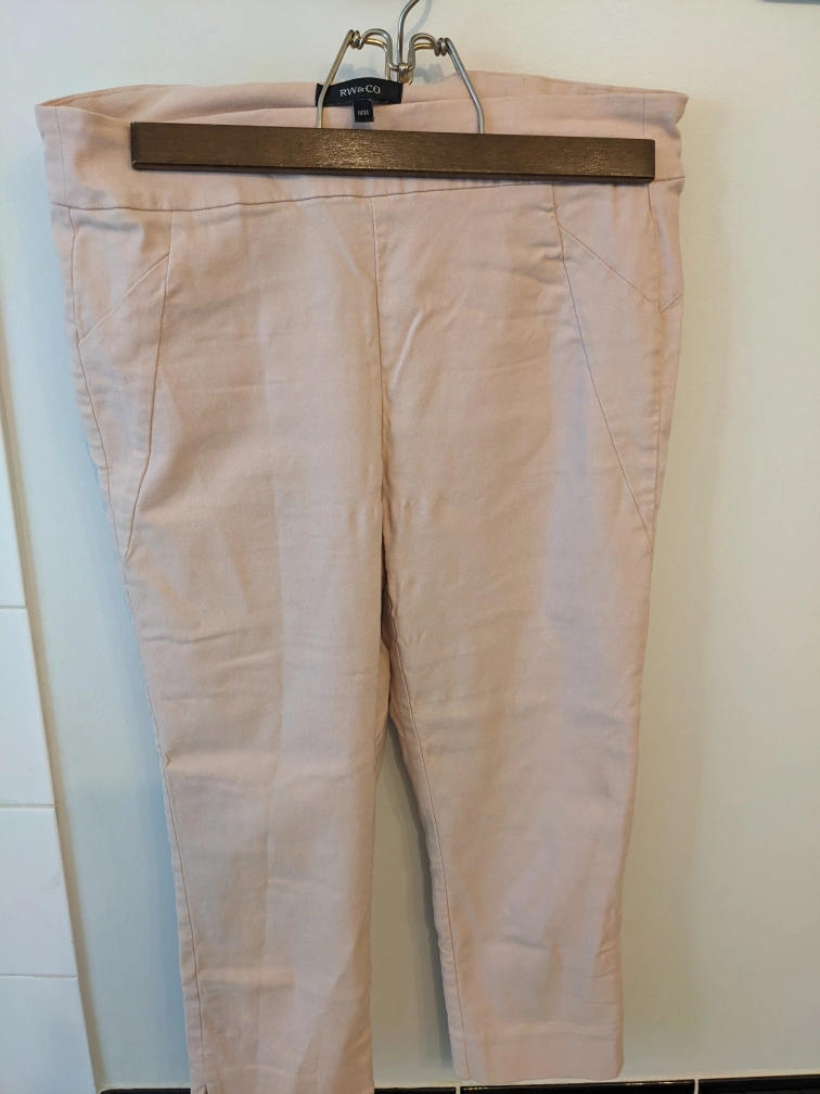A pair of light pink pants with a straight leg and a mid-rise. They have belt loops and two pockets in the back. One pocket has a slight opening that is not noticeable