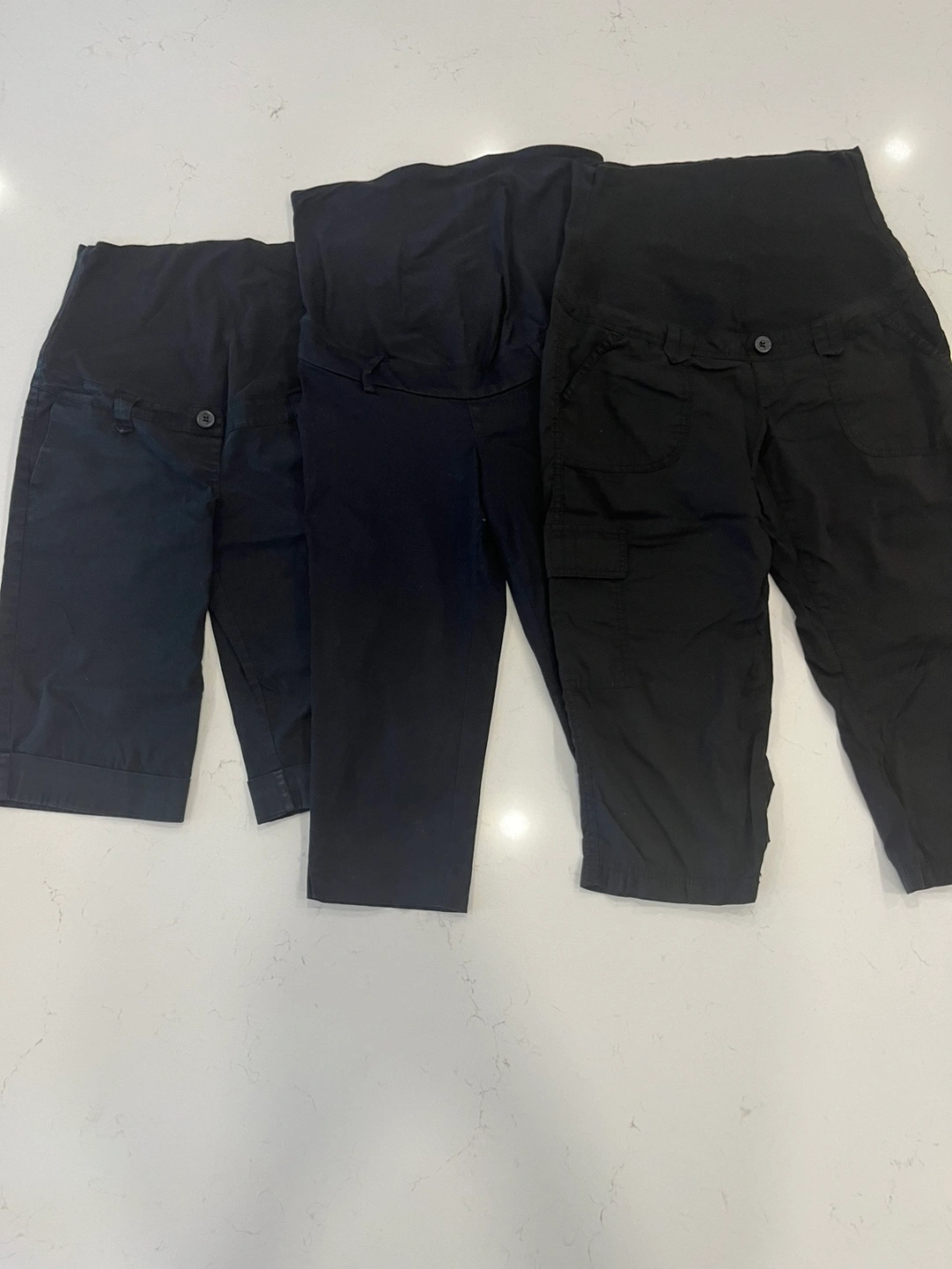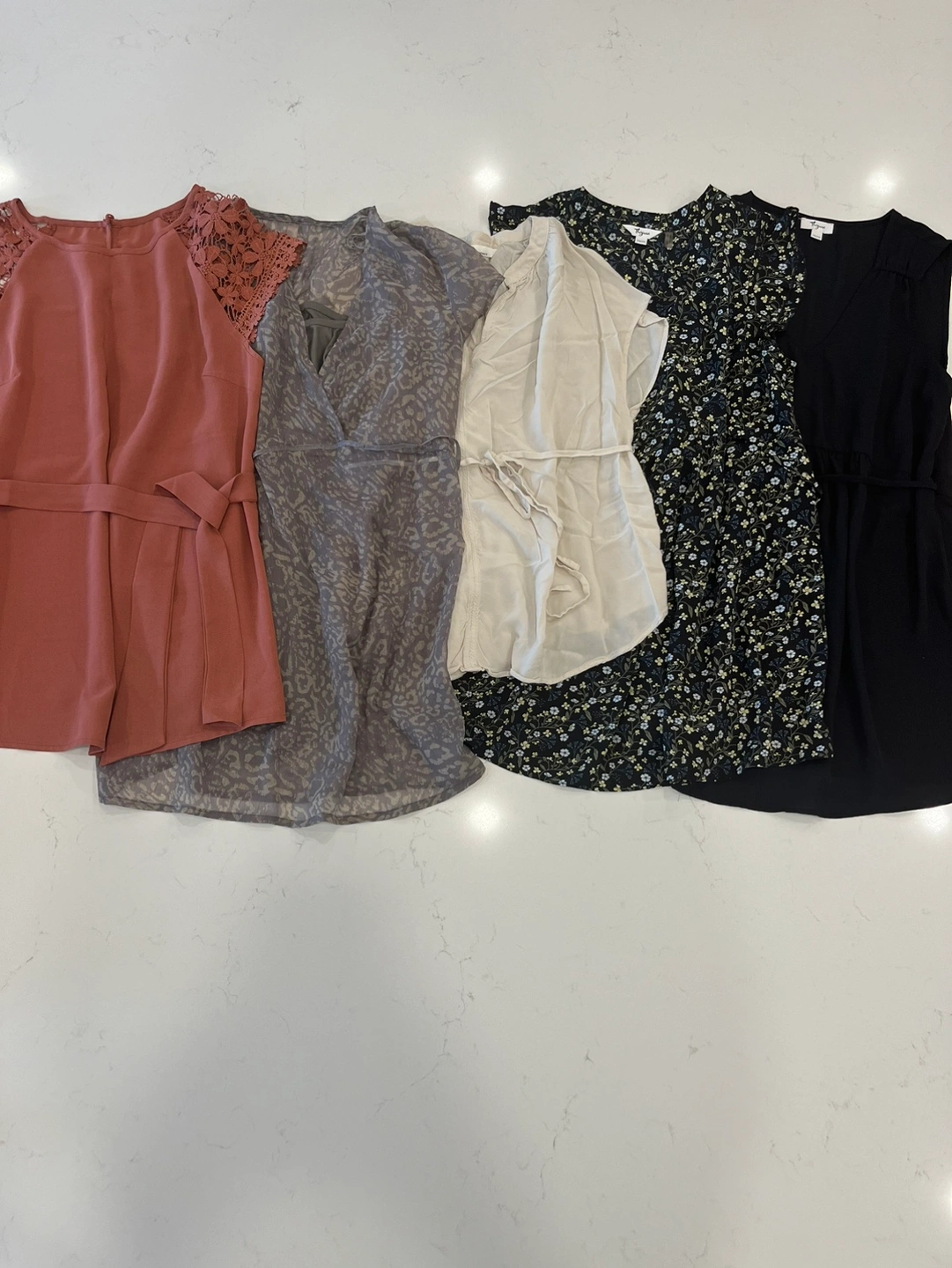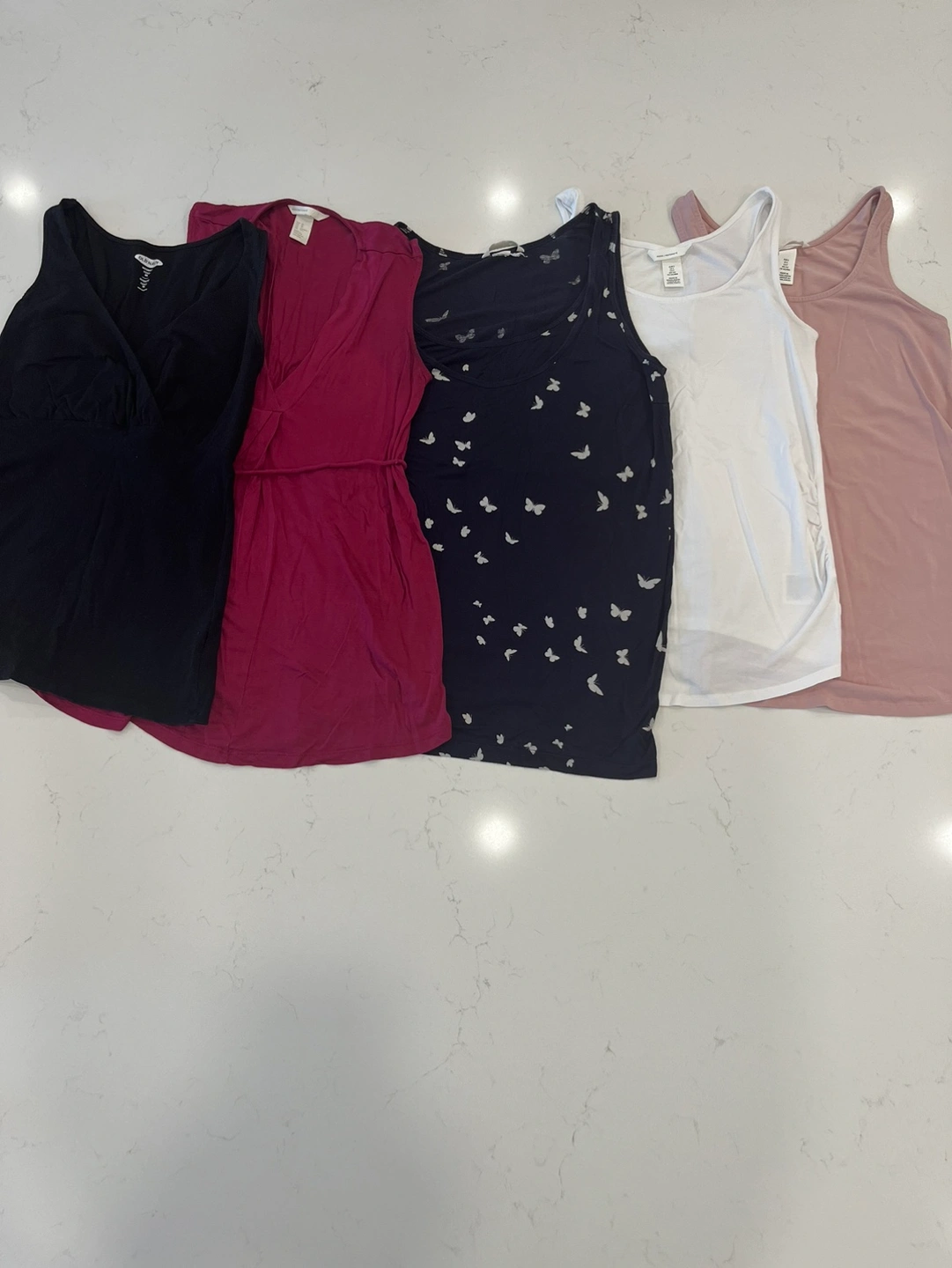 Maternity clothing bundle. As pictured: 6 blouses, 5 tank tops, 4 tshirts, 3 dress pants, 2 leggings, 1 jeans, 3 capris, 1 shorts, 1 overalls shorts, 1 bathing suit, and 2 bras.