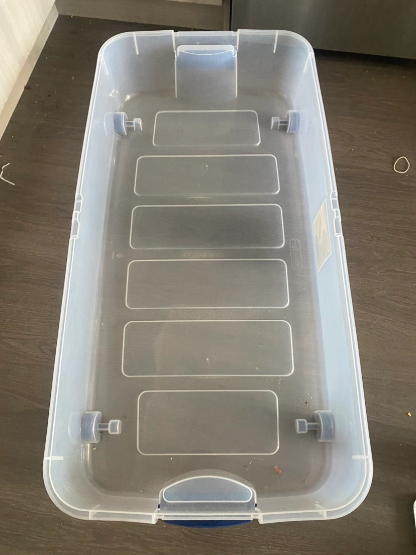 Four Clear storage bins with wheels. Great for under bed storage. All have hinged lids with handles that latch