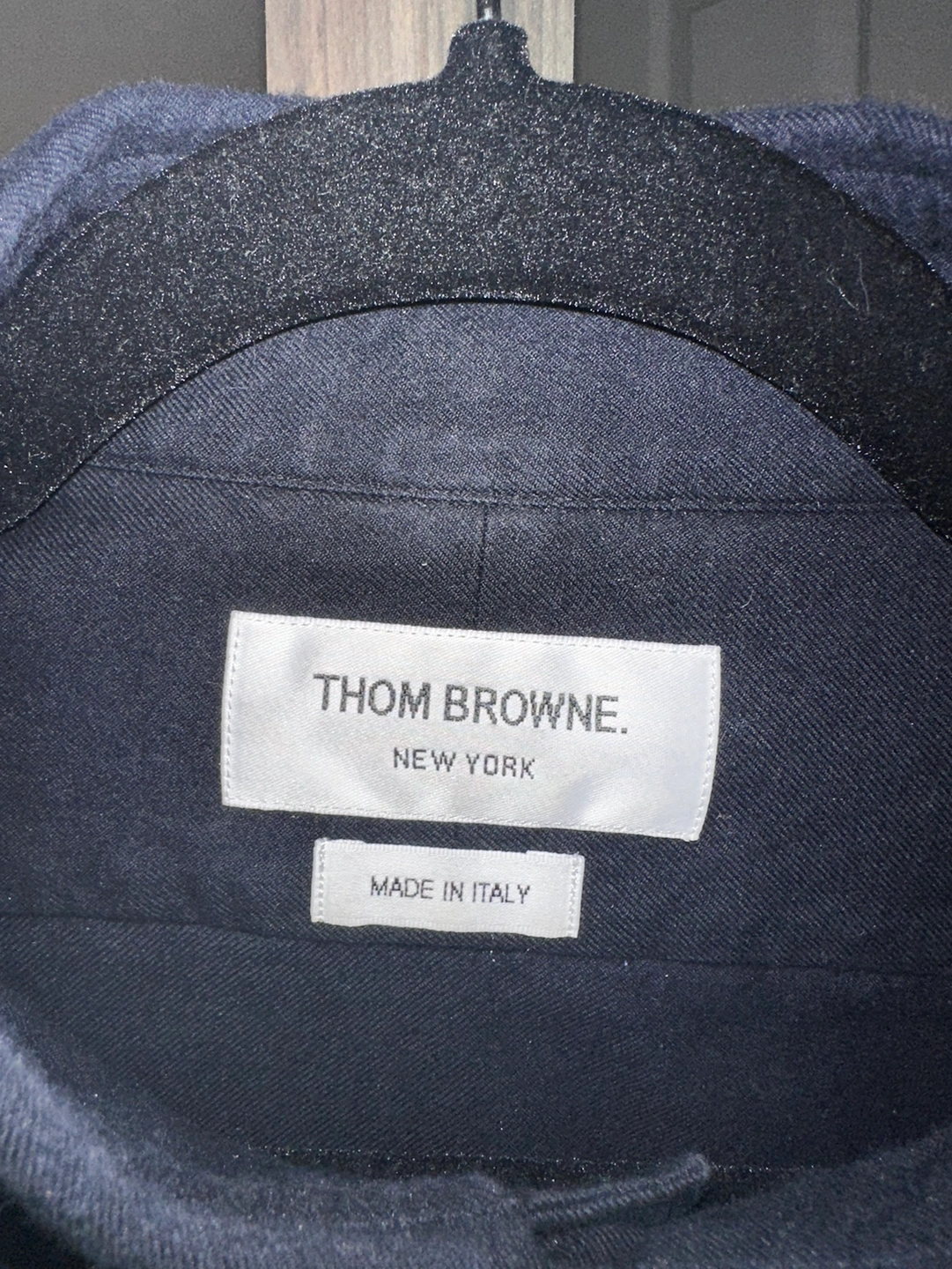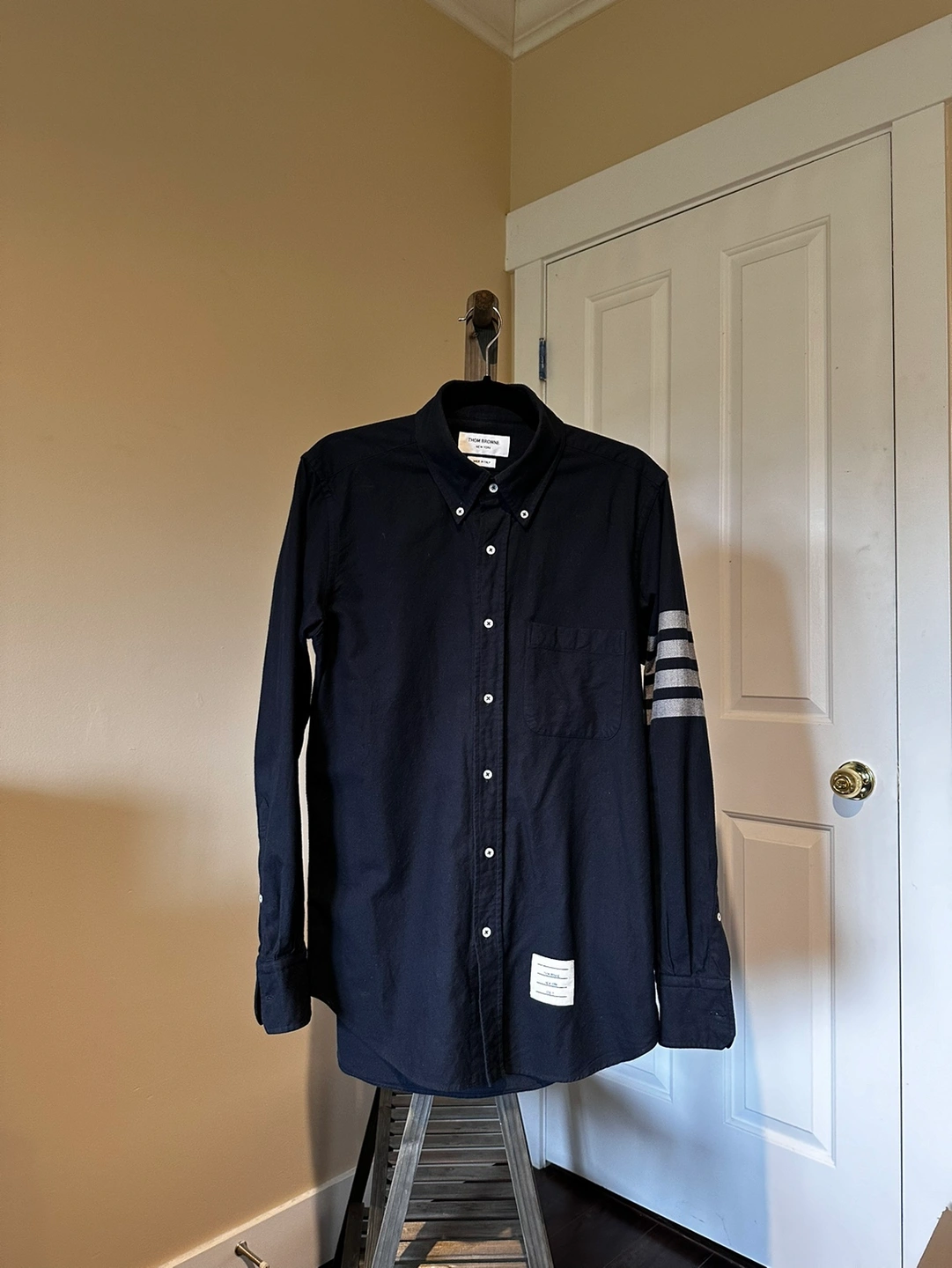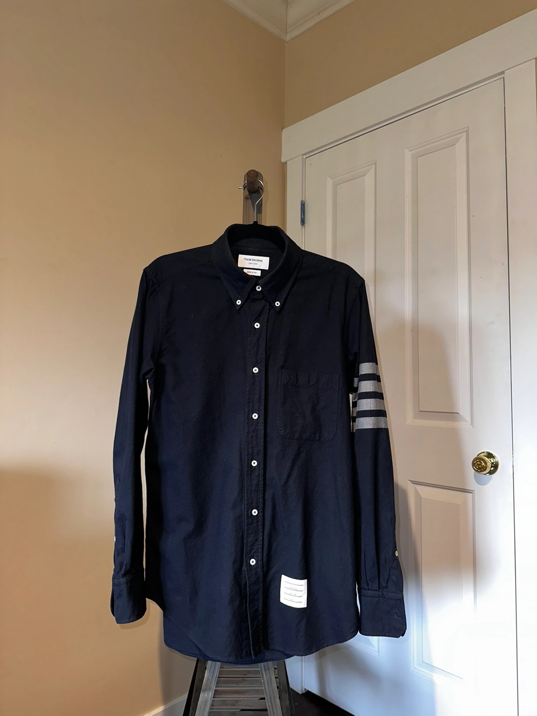 A men's long-sleeved oxford shirt with a button-down collar, chest pocket, and signature four-stripe detail on the sleeve. Made in Italy.