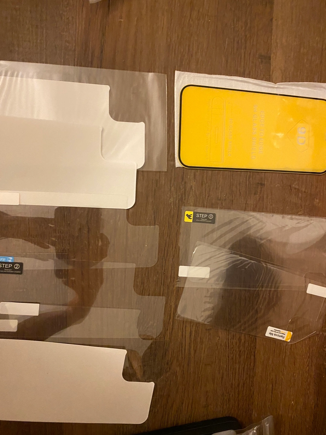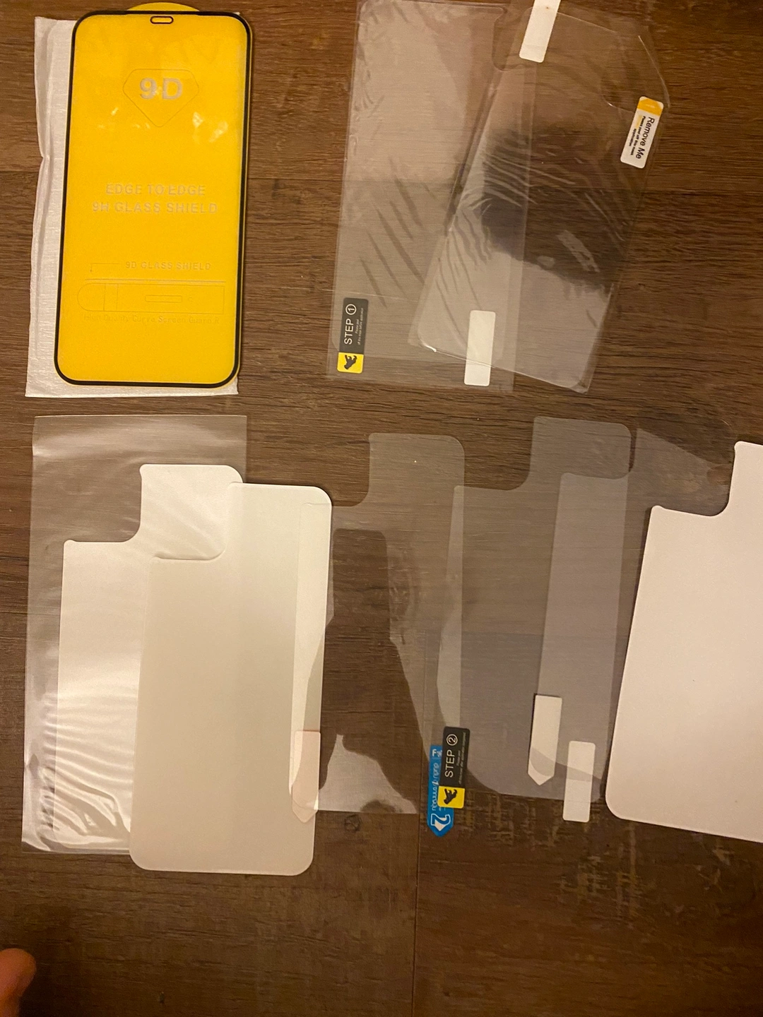 Set of phone screen protectors. Includes multiple sizes and styles. Camera protectors & screen protectors (glass and plastic over 5 pieces)