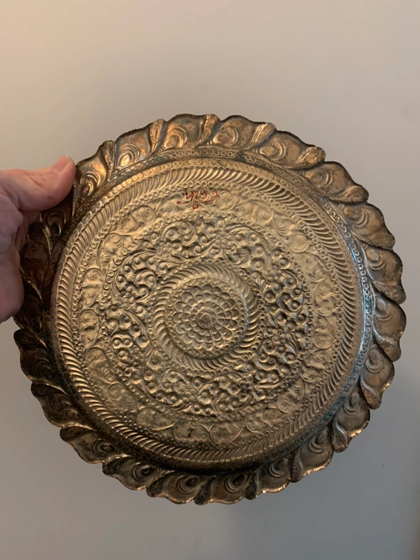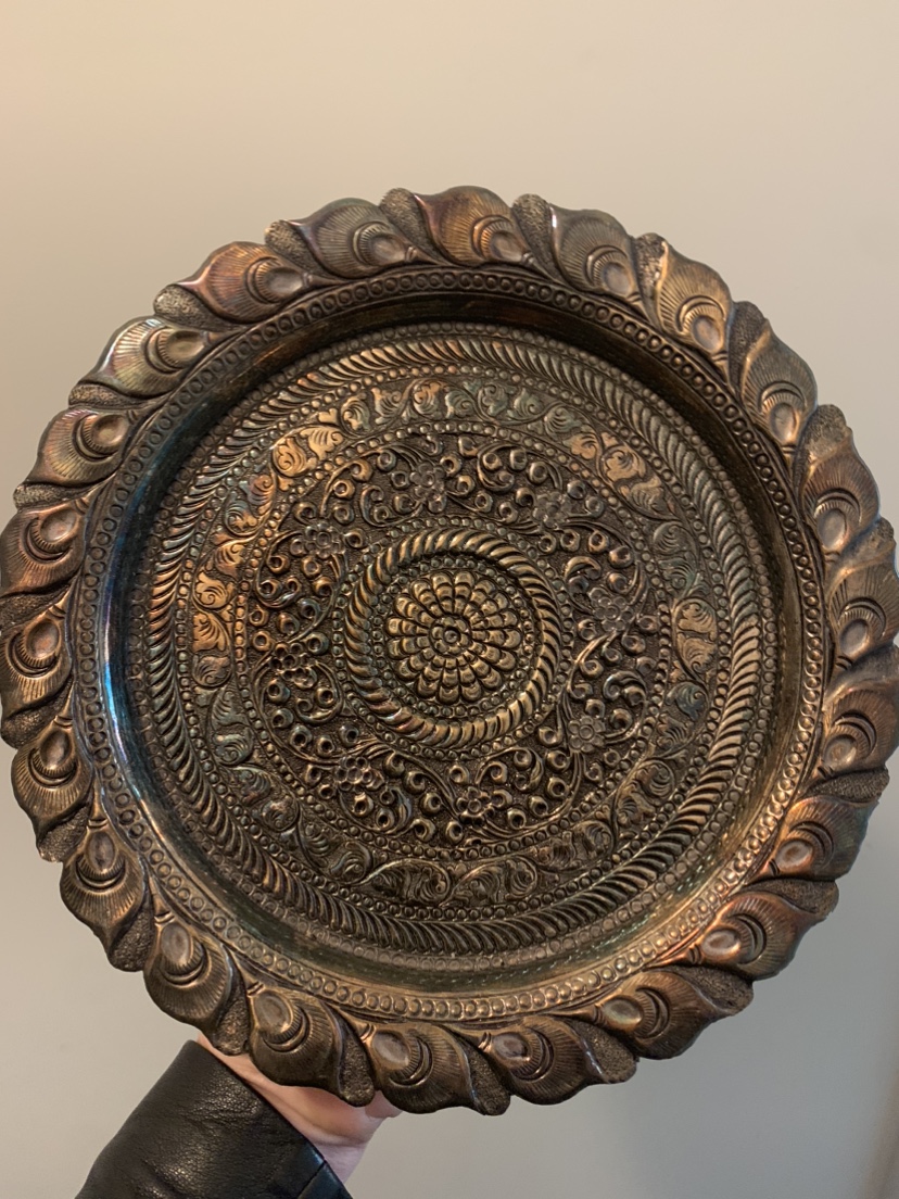 Metal decorative tray from India. It was given to me as a gift but unfortunate doesn’t fit with my space.