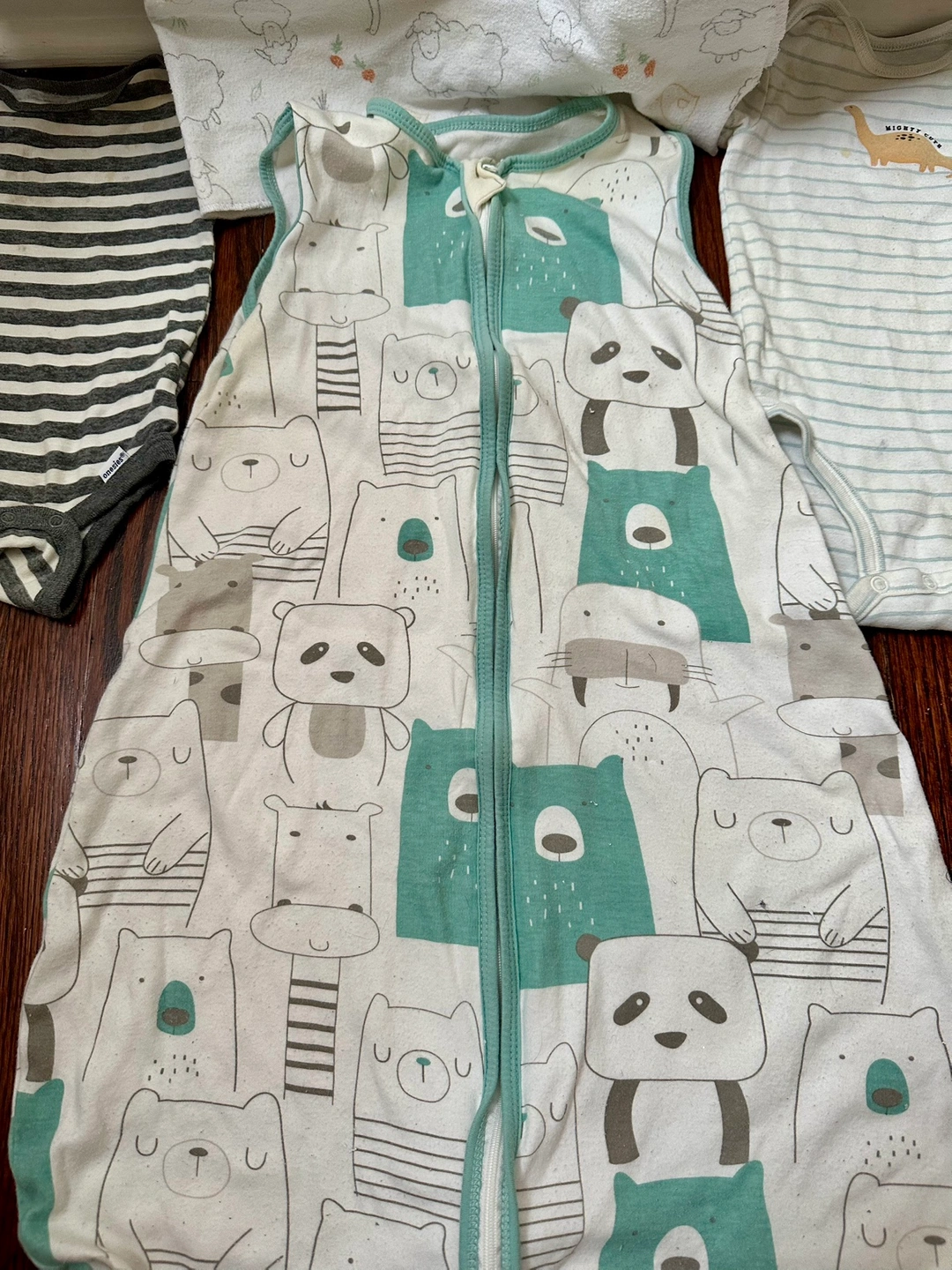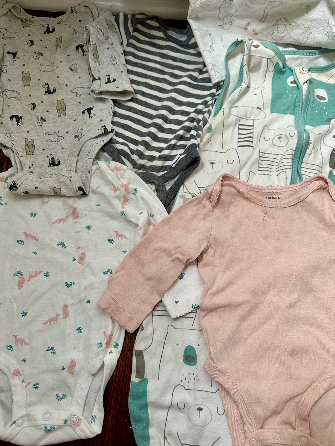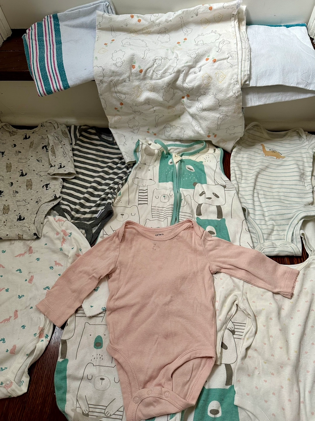 Giving away well-loved items to whoever needs it more. Includes a lightweight sleep sack (size S), 3 cotton blankets, 2 short sleeve onesies, 6 long sleeve onesies and 1 full onesie. Clothes are 3-6mts, big fit. Washed but white items could use another run with bleach.