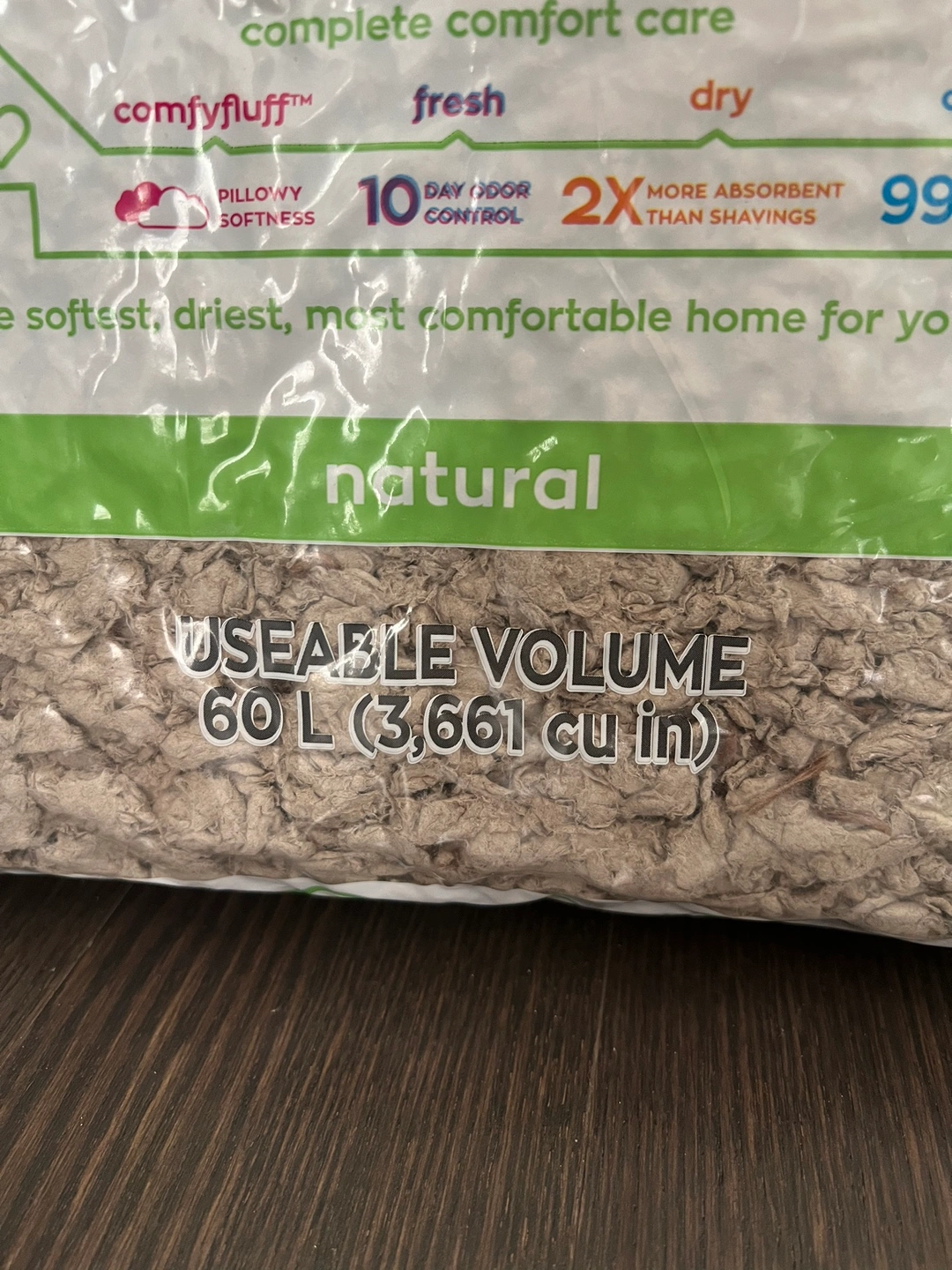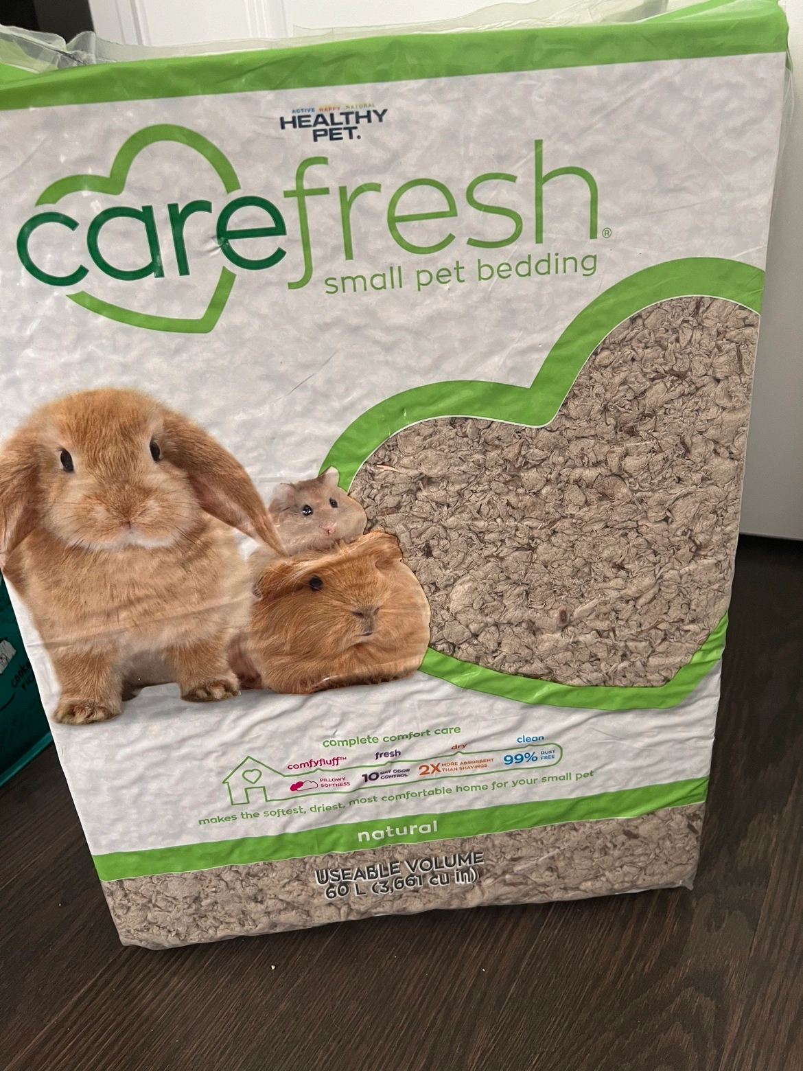 Brand new bag of small pet bedding, made with natural paper fingers to absorb odor and is soft on the feet too! I use it in the litter box mostly to absorb smell.